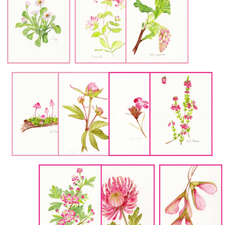 This beautifully boxed card set features 10 botanical greeting cards from my signature Pinks & Greens collection. Each design is printed from my original watercolour paintings, inspired by wildflowers, hedgerows, and the quiet charm of nature.