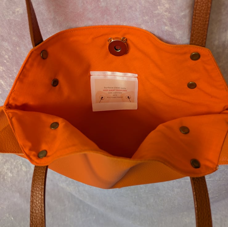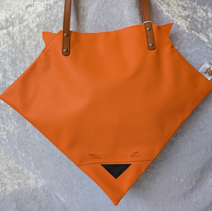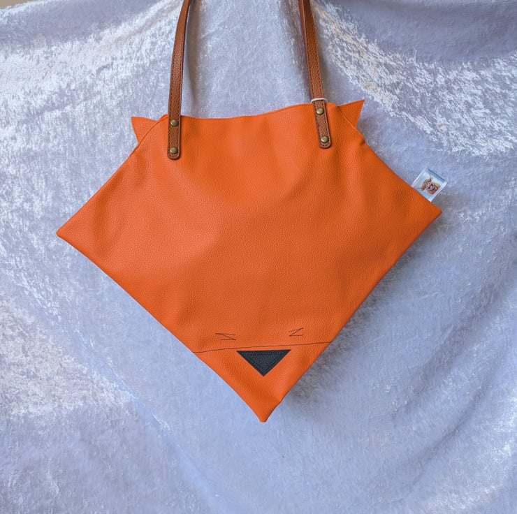 A cute characterful red fox handbag, made from faux leather. Angular in shape, it has little ears next to the straps and a sweet face in the bottom corner. The inside is lined and has a magnetic clasp to close it. The inside is smaller that the outer due to being sewn up with the face details. The outer bag measures 31 cm in height by 40 cam in width. The straps fit comfortably over the shoulder or on the arm.