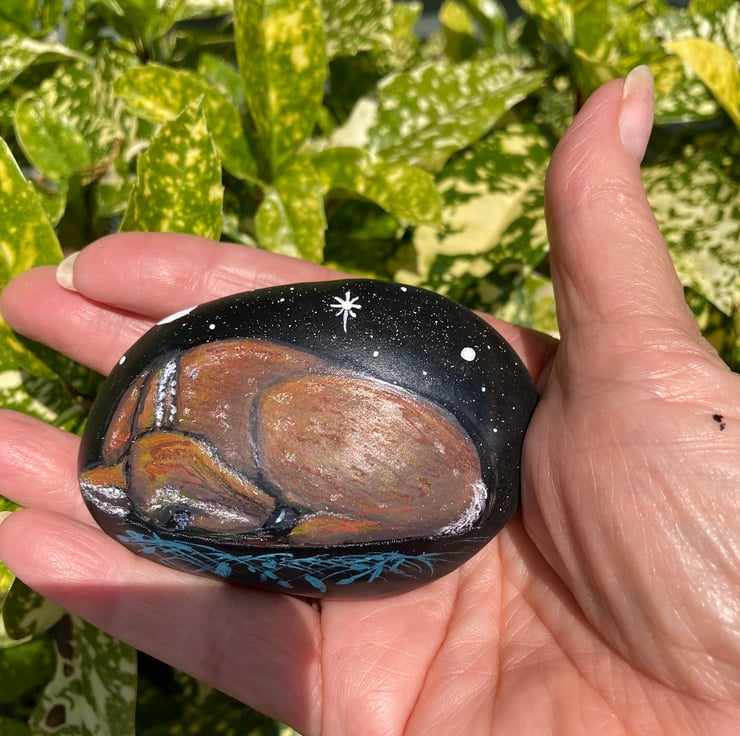 Hand painted Sleeping Fawn / Baby Deer Natural Stone - Rock Art