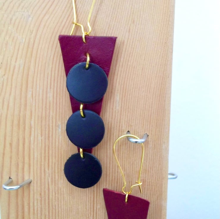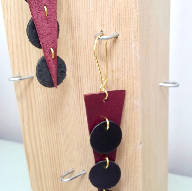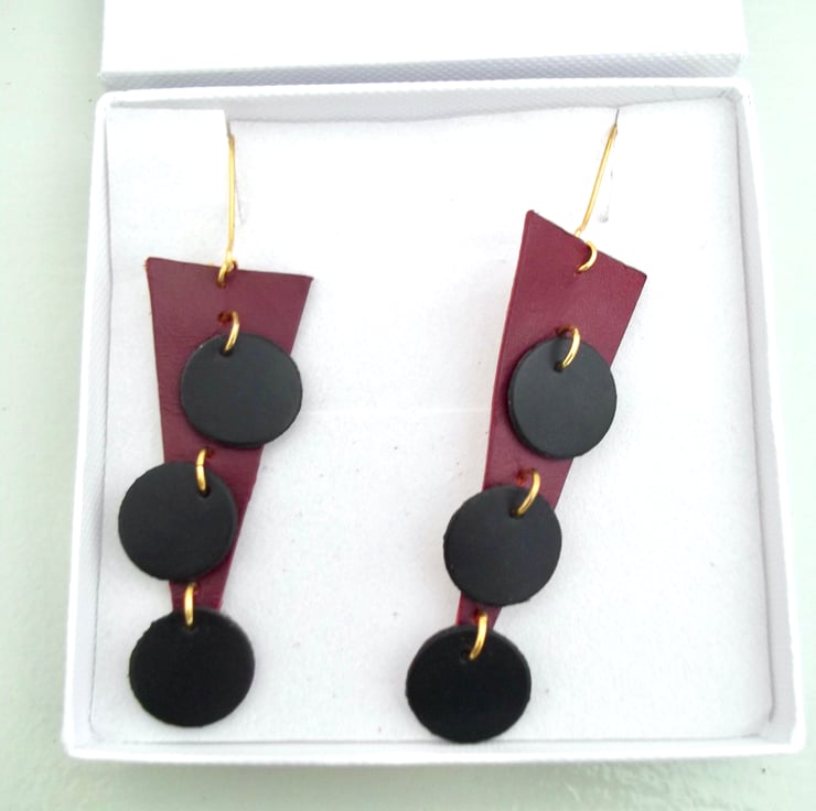 Leather Dangle Drop Earrings Contemporary Style Claret and Black
