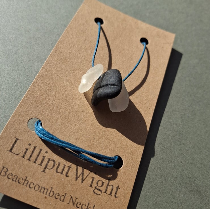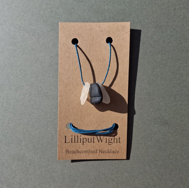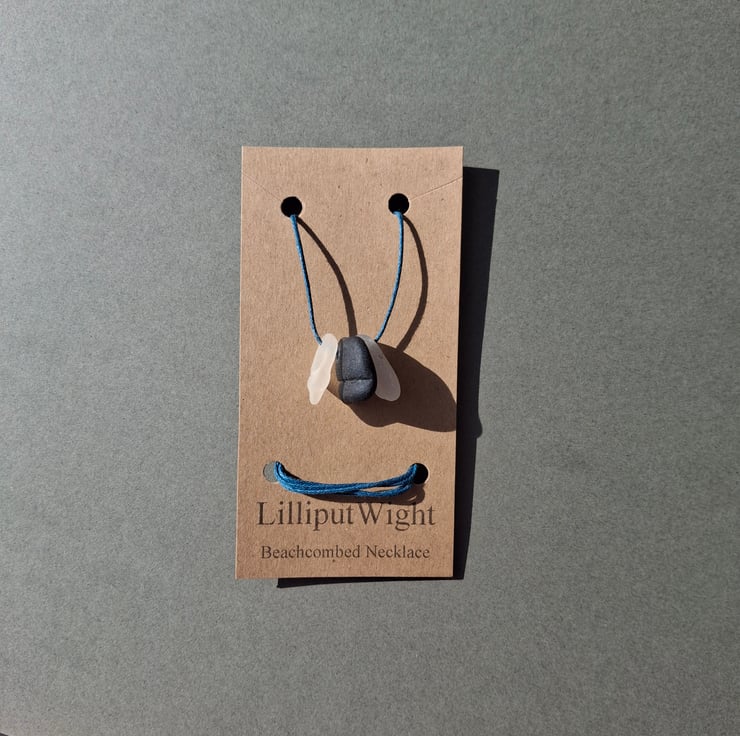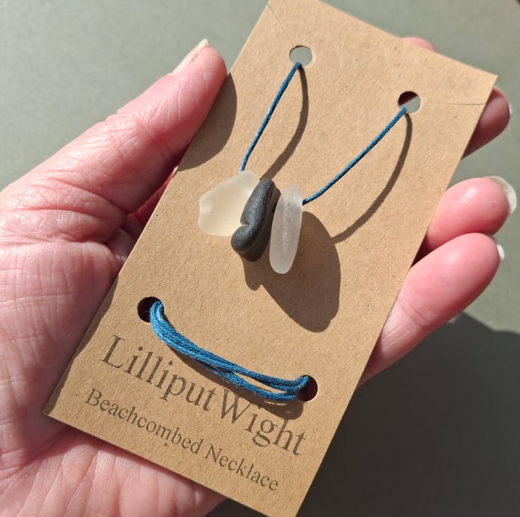 This necklace is made from naturally shaped pieces of sea glass. The sea frosted glass pieces have been suspended from a cord of blue waxed cotton. A pair of sliding knots allow the length of the necklace to be adjustable and yet stay at the desired length.