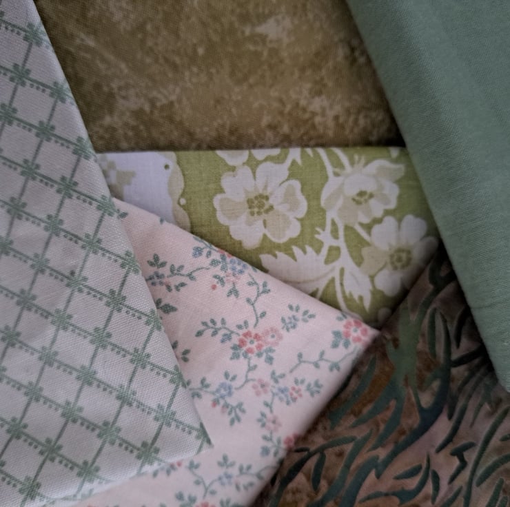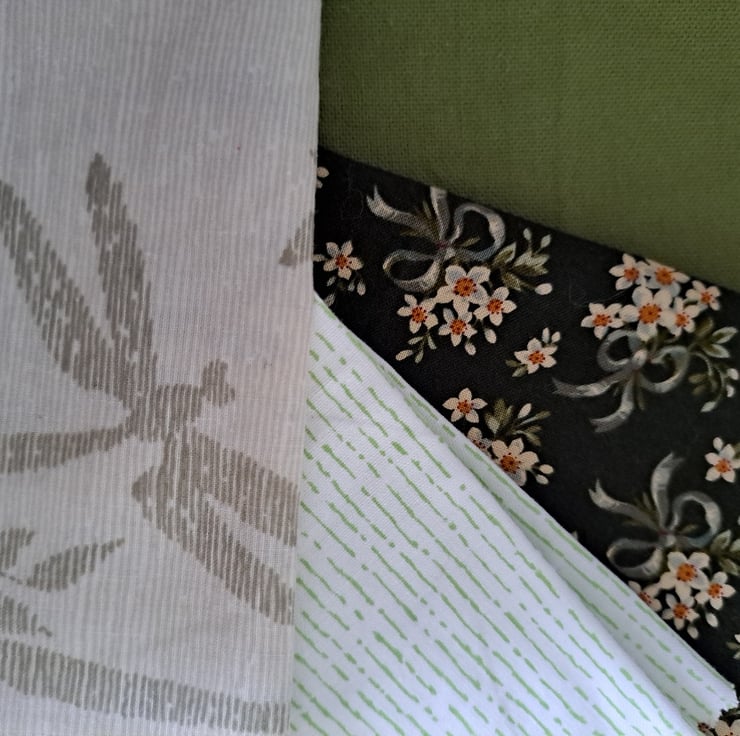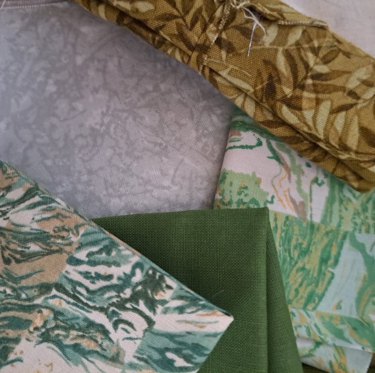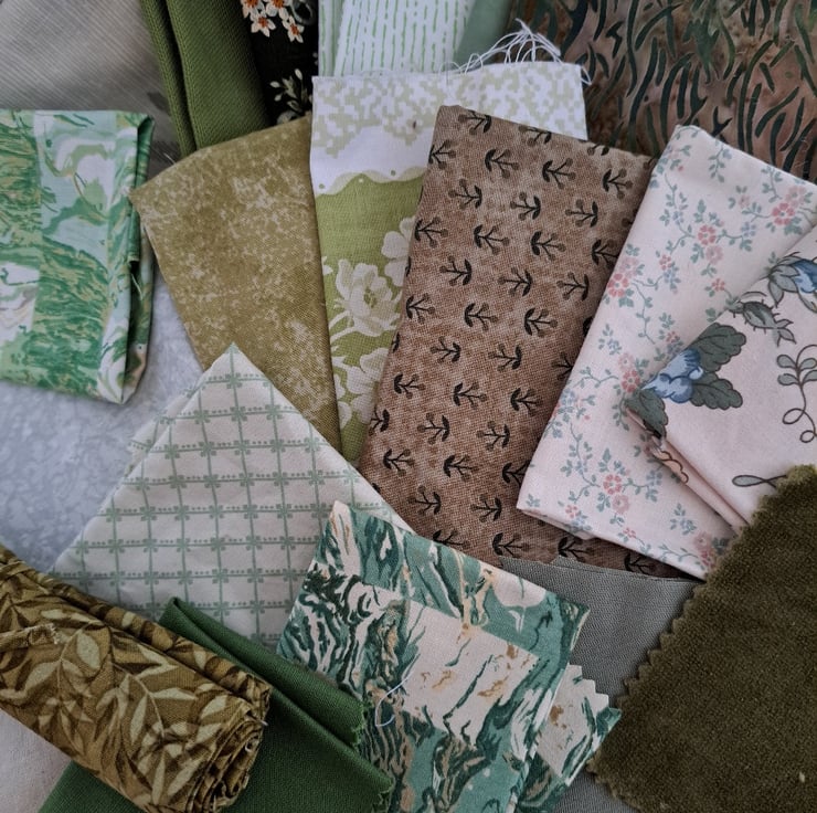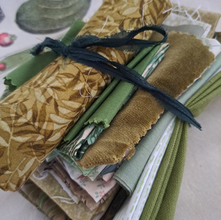 Lovers of green, prepare to immerse yourself in the sensory goodness of this generous bundle of 18 fabrics, which includes quilting material, precious vintage pieces, a full fat quarter and even a square of green velvet (for fun). These are mixed weights and includes a few light furnishing fabrics. I love the lush lot of it!