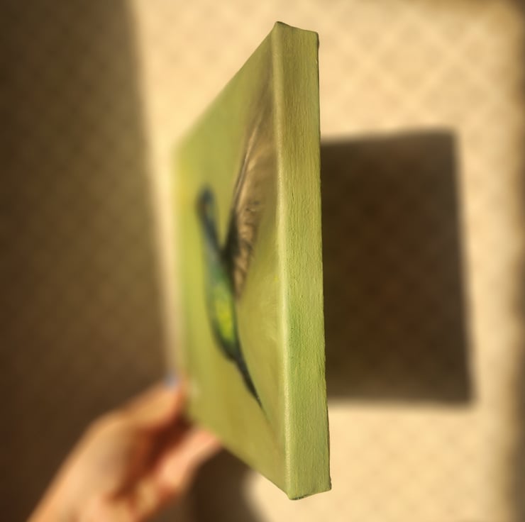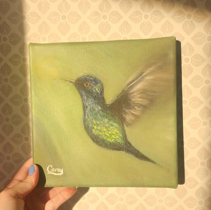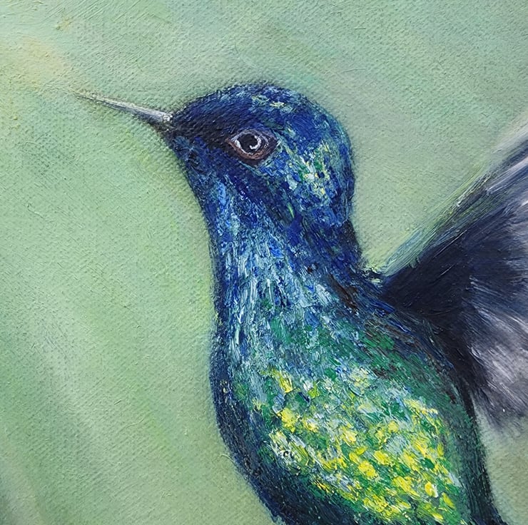 8x8 Inch, 20x20cm Original Oil Painting on Stretched Linen, featuring a blue hummingbird.