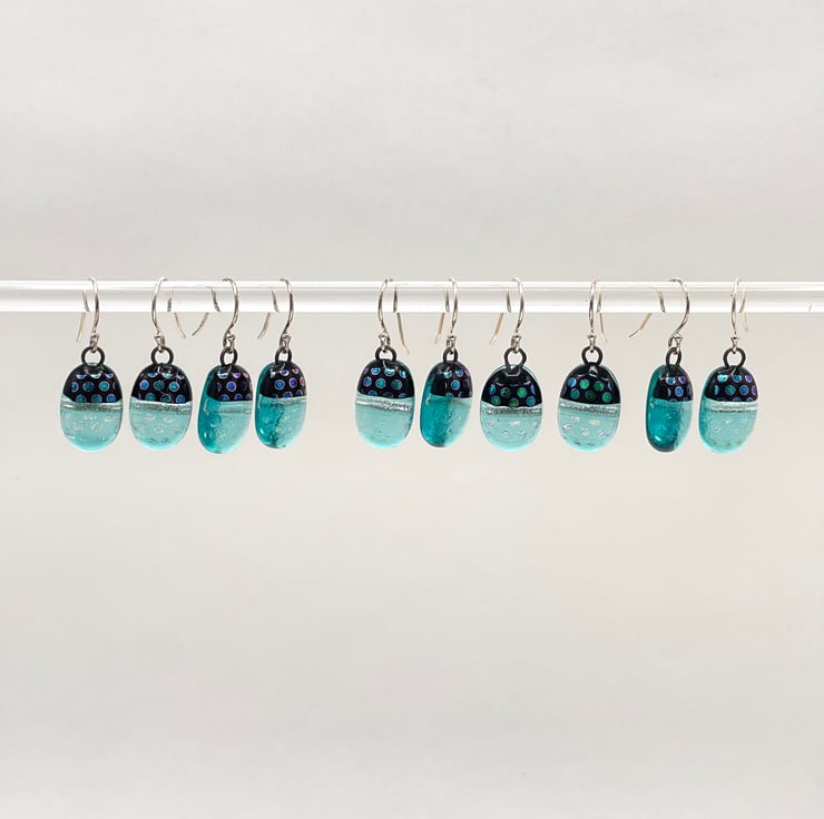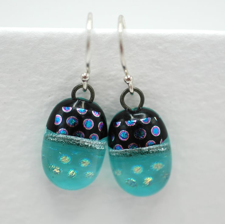 I love the beautiful colour range of Bullseye glass, these dichroic spotty earring designs remind me of iridescent beetles, the colours just shimmer.