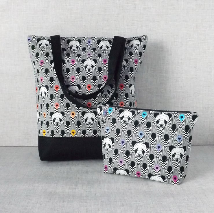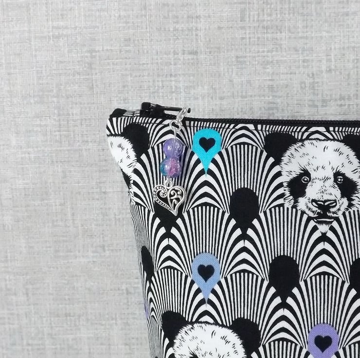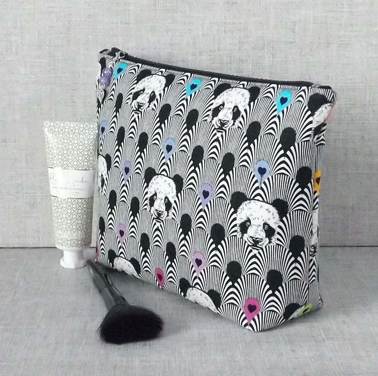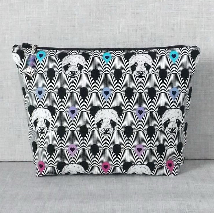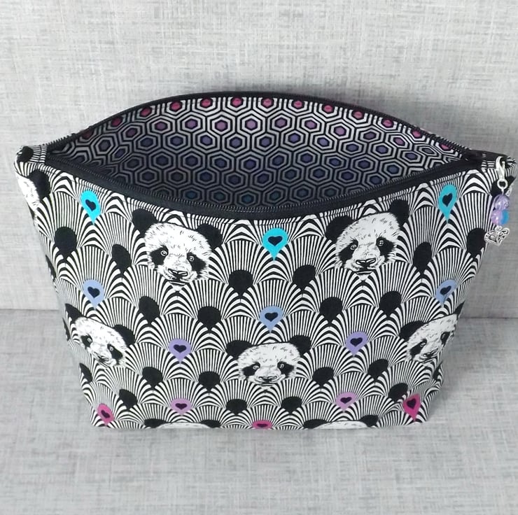 A large sized zipped pouch, project bag, cosmetic bag, The main fabric is by Tula Pink and has a monochrome geometric design with Panda heads and small drops of colour added throughout the design in various colours. It is lined in a co-ordinating fabric from the same range by Tula Pink,