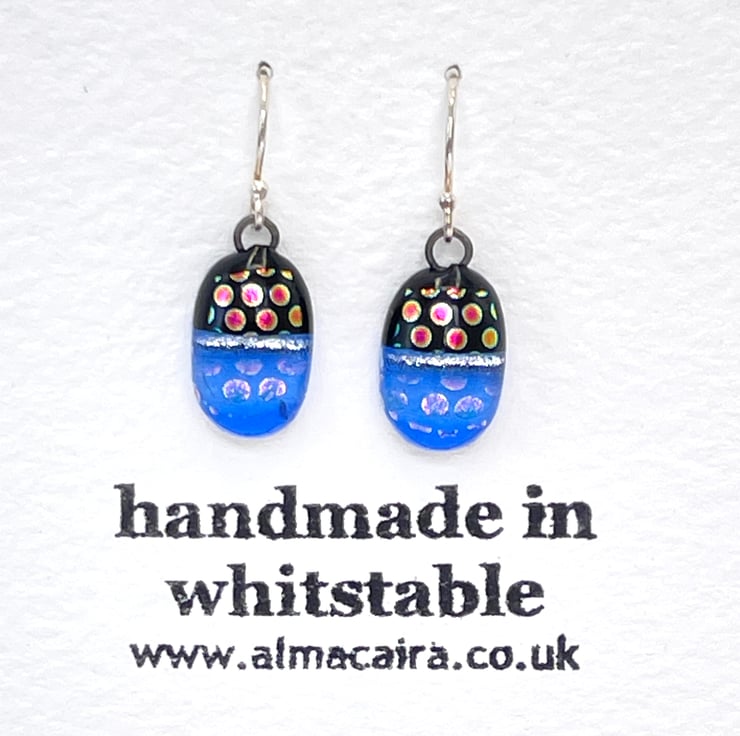 I love the beautiful colour range of Bullseye glass, these dichroic spotty earring designs remind me of iridescent beetles, the colours just shimmer.