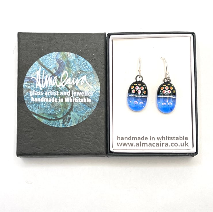 Created from layered Bullseye glass in my Whitstable garden studio. Sterling silver ear wires.