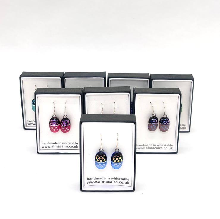 Kiln fused glass has a natural fluid quality and no two pieces are exactly the same. Earrings are created as a matching set but there will always be slight differences between the two and that's what's so lovely about buying handmade!