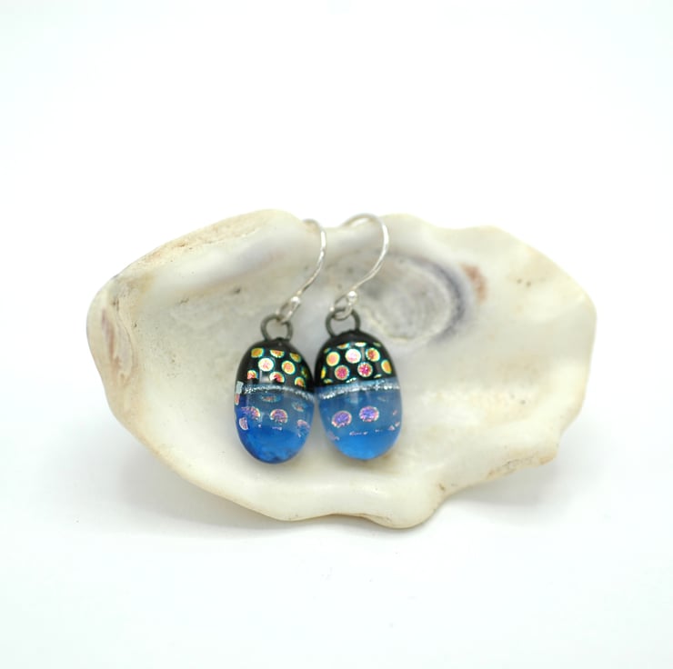 Pale blue spotty dichroic glass drop earrings.
