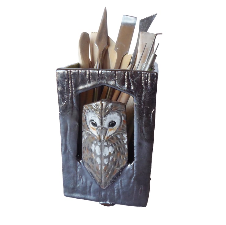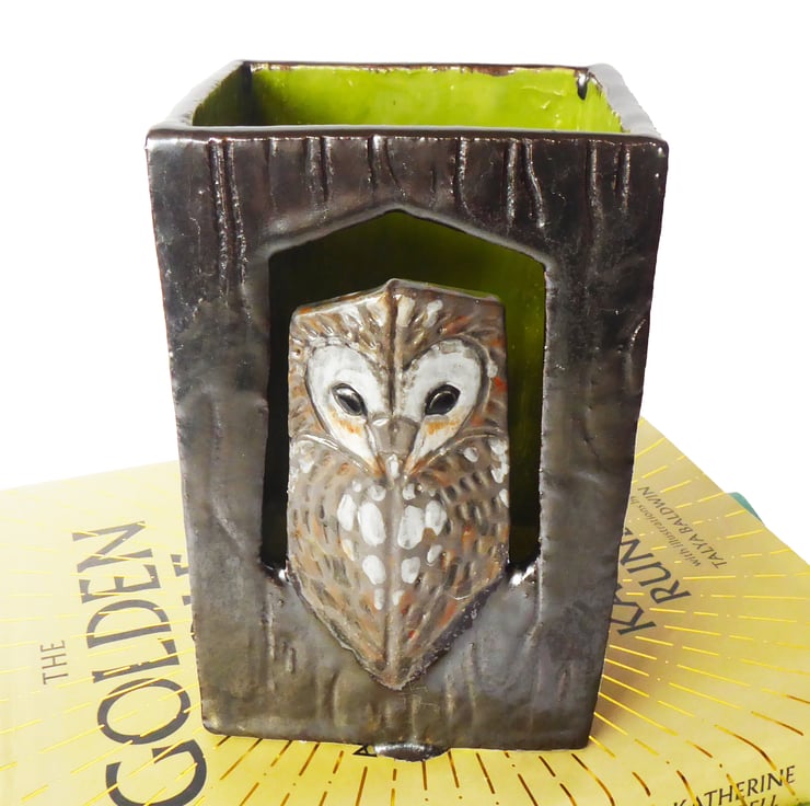 Tawny Owl in Tree Ceramic Pot with Sgraffito Decoration.