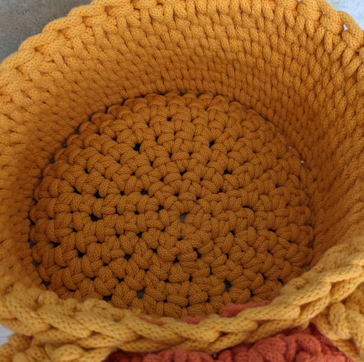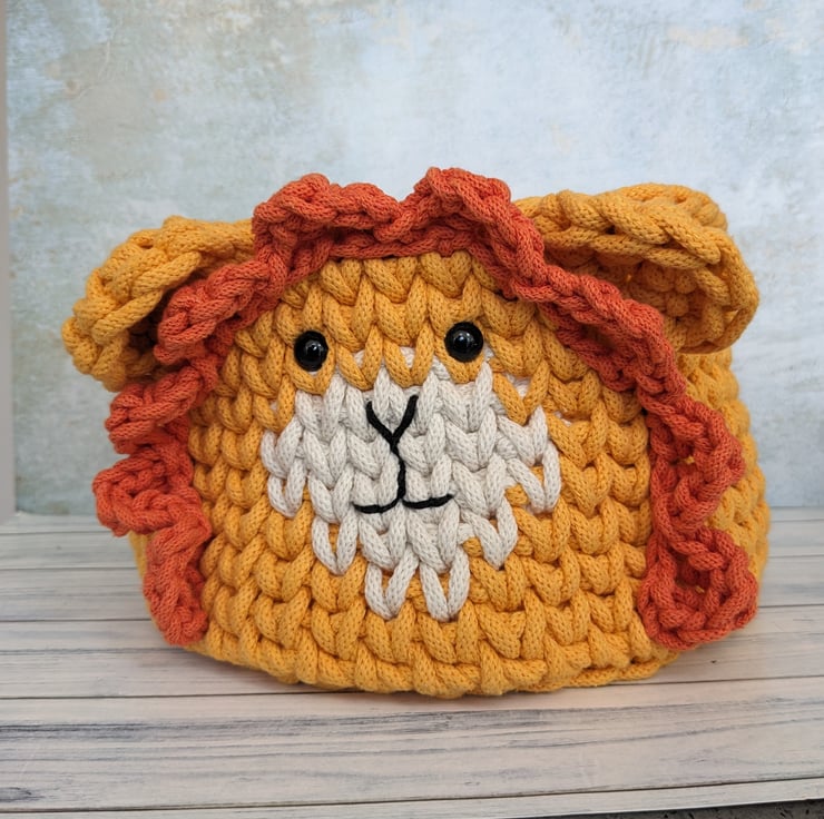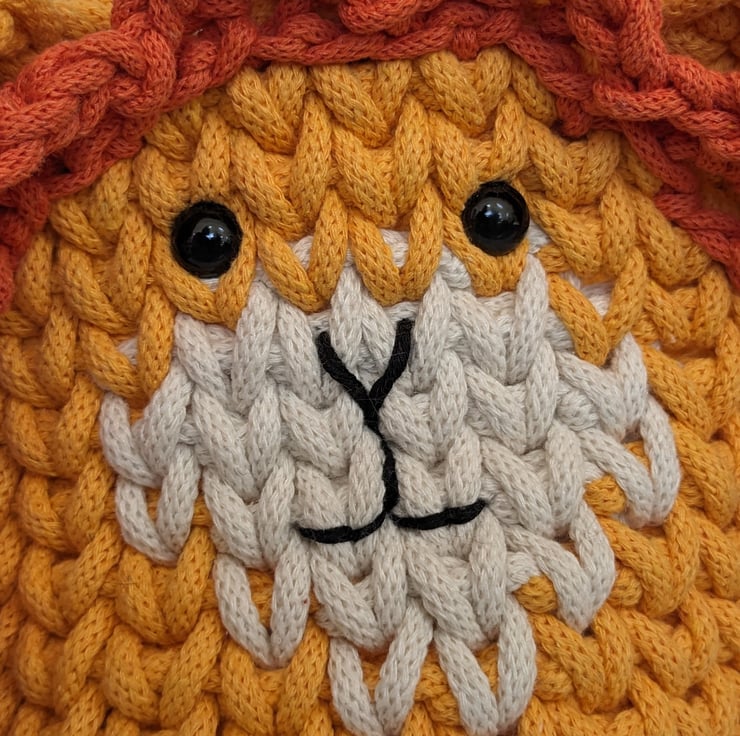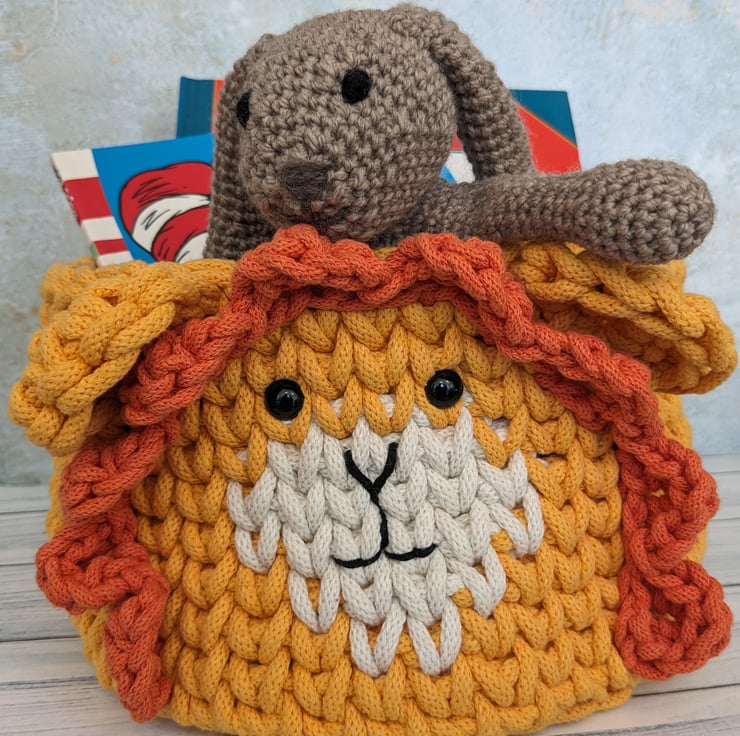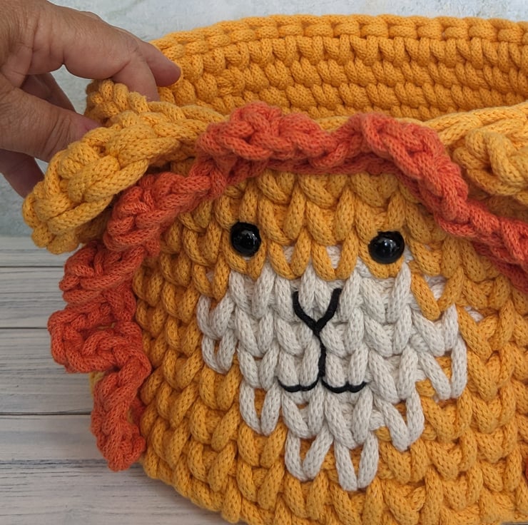It is hand crocheted by me, using a decorative stitch that looks like knitting. The way this stitch is worked really helps the basket keep its shape. The mane is crocheted onto the basket and the ears are securely sewn in place. The facial features are hand embroidered using a mercerised cotton yarn, I have used toy safety eyes and covered the backs with yellow felt circles hand sewn to the inside of the basket.