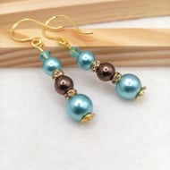 The large dark turquoise and buttermilk earrings are made using two 8mm glass pearl beads and one 6mm silver coloured diamanté spacer rondelle finished off with a cute love heart design. These larger earrings are featured in the leaf dish photo.