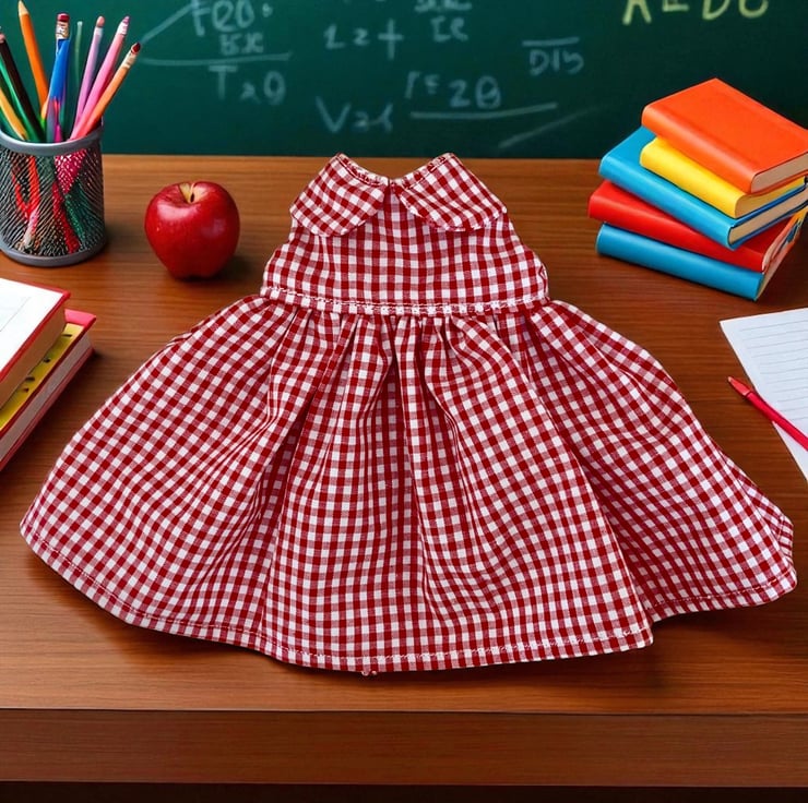 A lovely red checked school dress, to fit the Mulberry Green characters. The dress is made from cotton and has a Peter Pan collar and a lined bodice.
