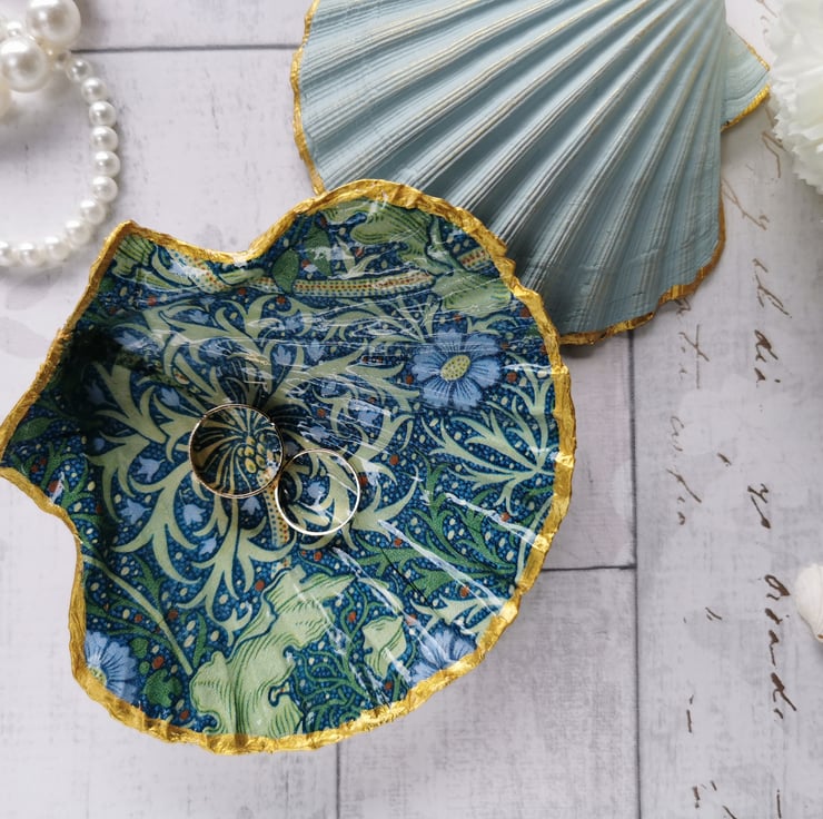 A decorative ring or jewellery dish in a teal William Morris Seaweed design. These trinket dishes are handmade using the decoupage technique on to natural scallop shells. The shells are sealed and glazed with resin on the inside, giving them durability and a beautiful glossy porcelain look. The edges of the shell are gilded with gold. The backs of the shells are hand painted and brushed with gold.