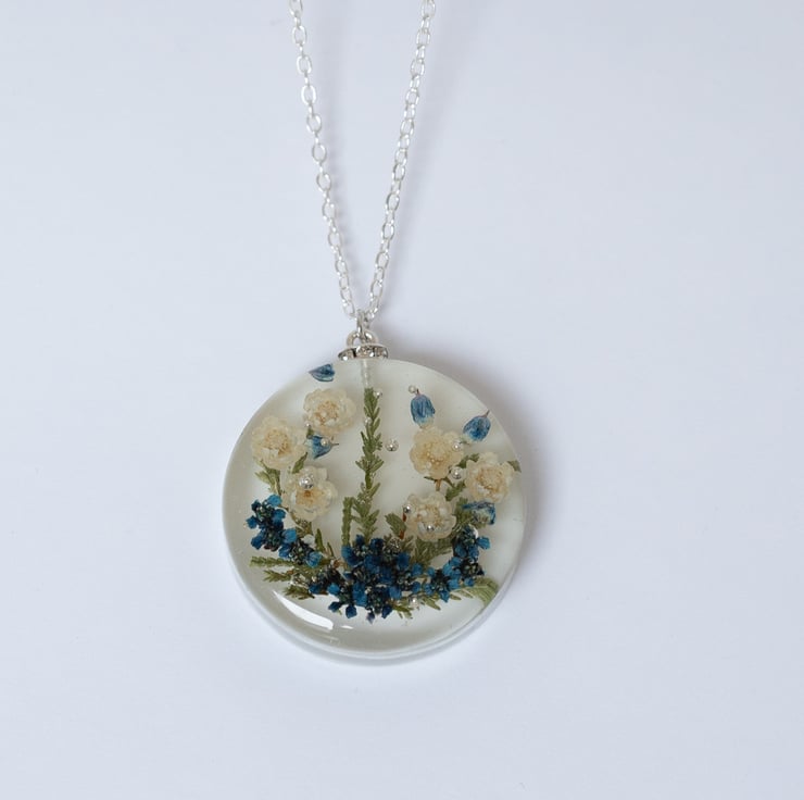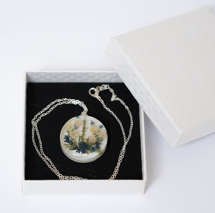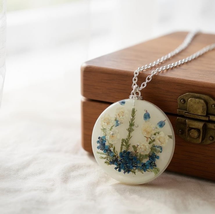 This round resin pendant (3.5 cm) is handcrafted with real pressed flowers in delicate white and deep blue tones. Each piece is one-of-a-kind, capturing a little piece of nature you can wear every day. A perfect gift for nature lovers, bridesmaids, cottagecore fans, or as a sentimental long-distance keepsake. Lightweight and elegant, it adds a soft botanical touch to any outfit.