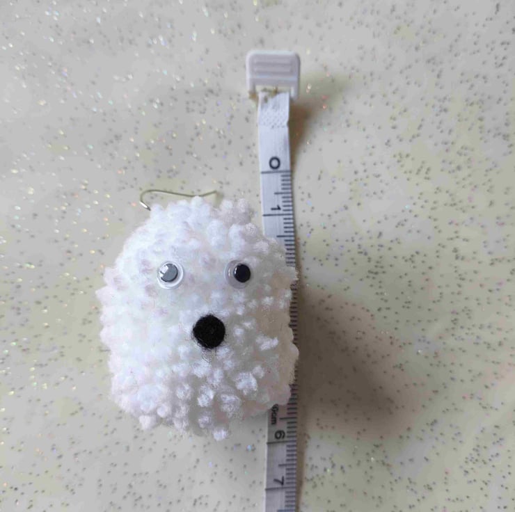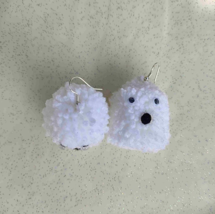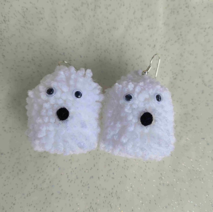 Handmade pom pom ghost earrings, complete with surprised face and googly eyes