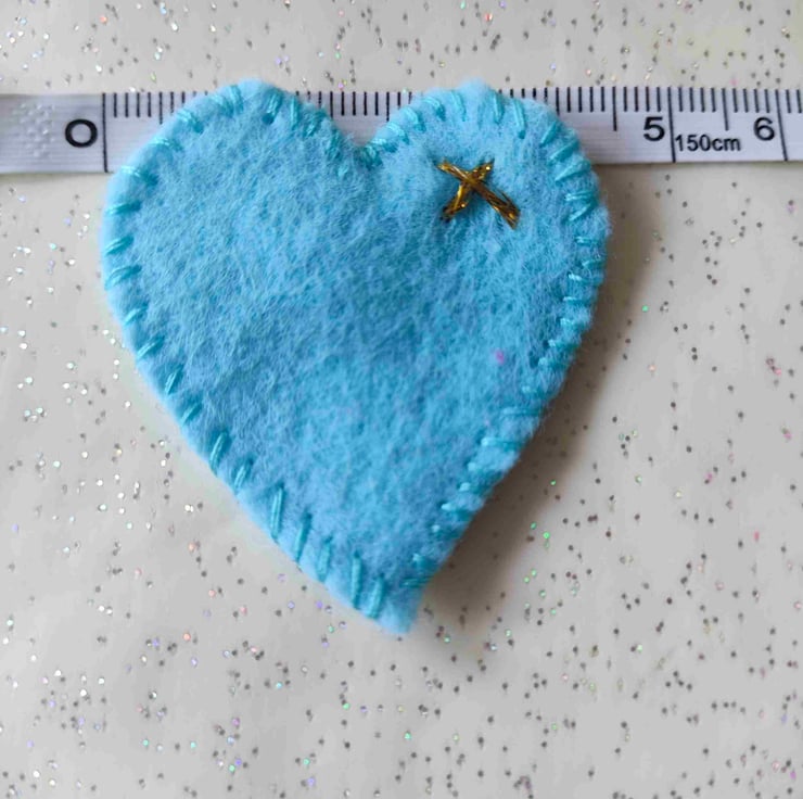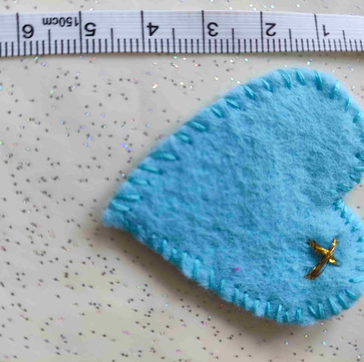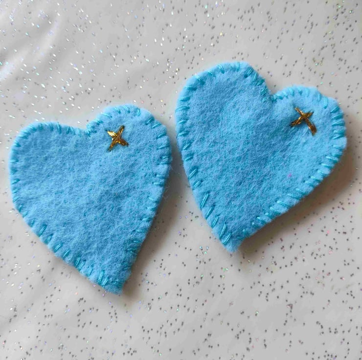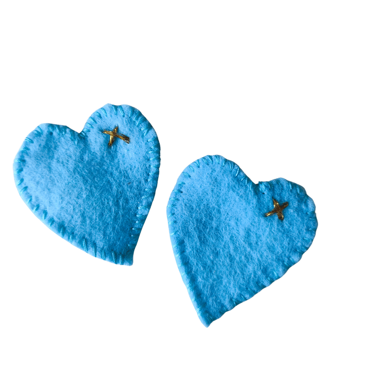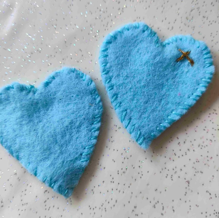 Handmade felt blue hugs with a gold kiss sewn on by hand