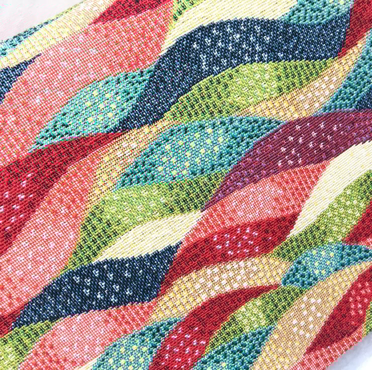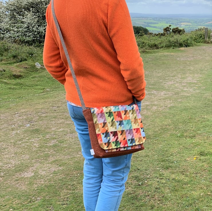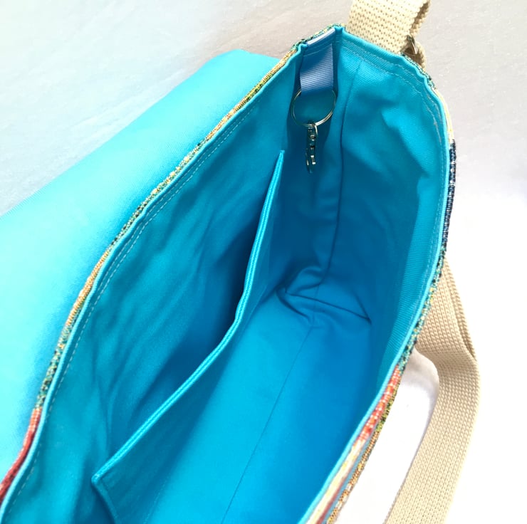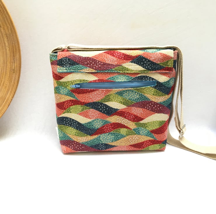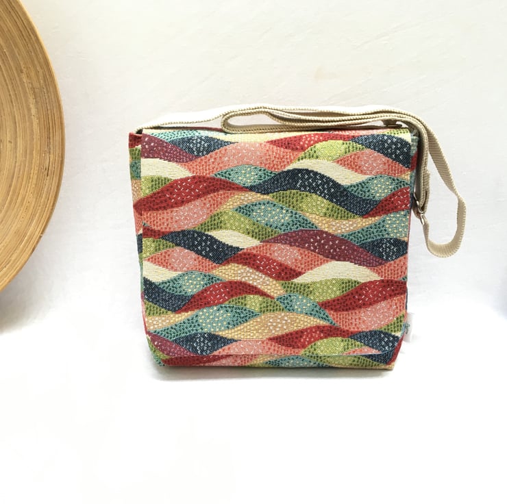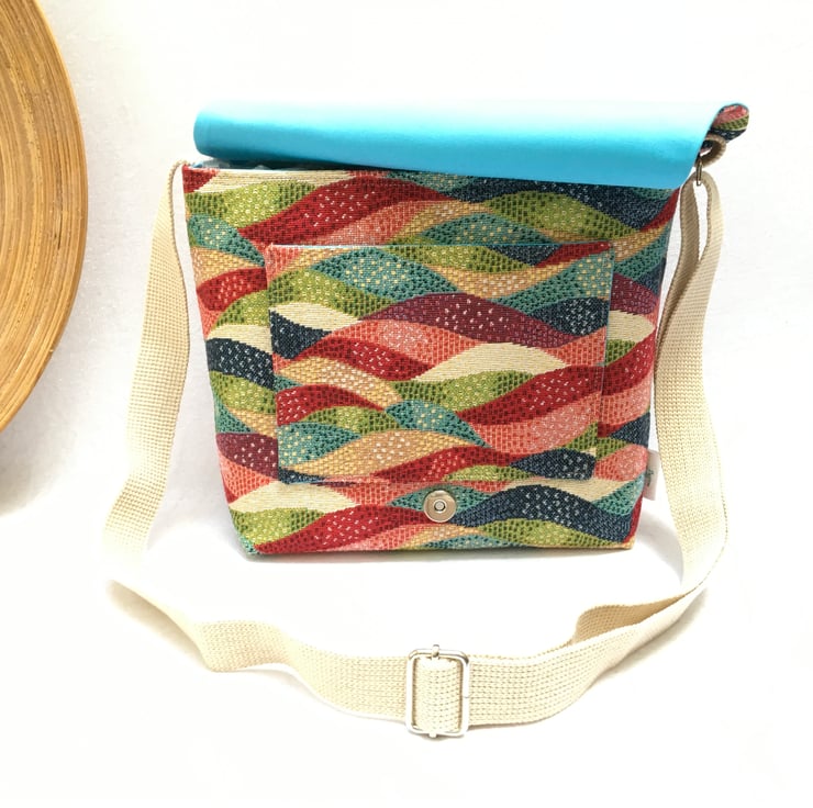 This small messenger style bag has a beautiful wave design in a colourful tapestry fabric. Inside it is fully lined in a blue cotton. There is a pocket inside and a handy key fob with another pocket under the flap and a zipped pocket on the back.