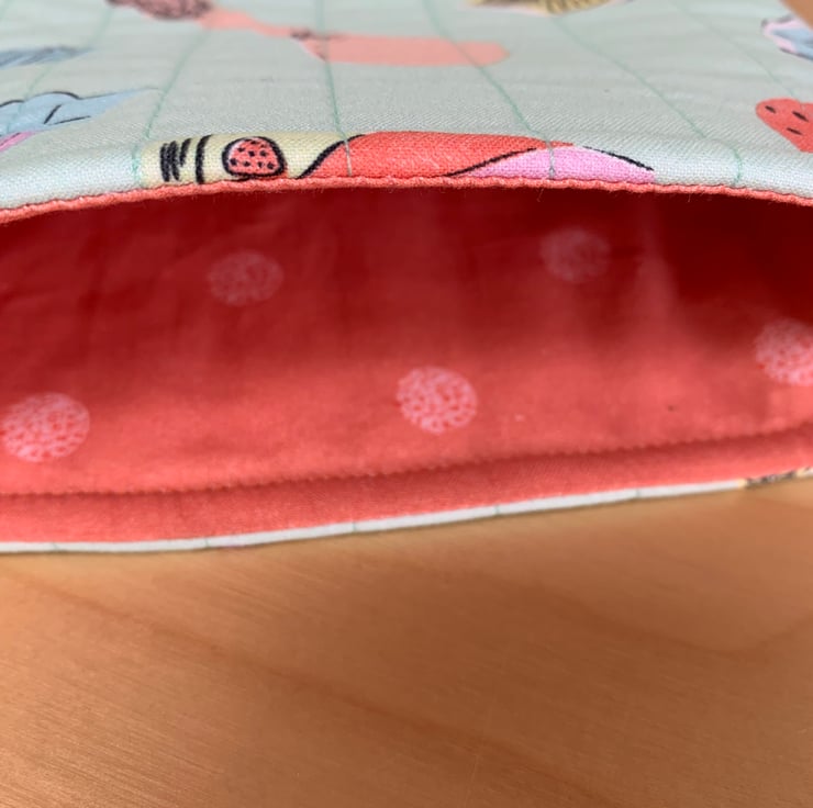 The sleeve is quilted with mint colour stitching and is lined in coral pink spot design cotton.