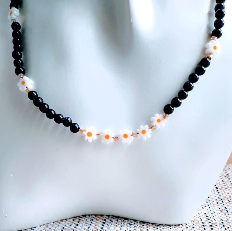 Let your style sparkle with the shimmer of midnight blue sparkling goldstone glass beads, known for their galaxy like sparkle. Paired with delicate glass daisy shaped beads, adding a feminine floral twist. Full of nostalgic memories of childhood summer days sitting in the grass making a daisy chain strand.