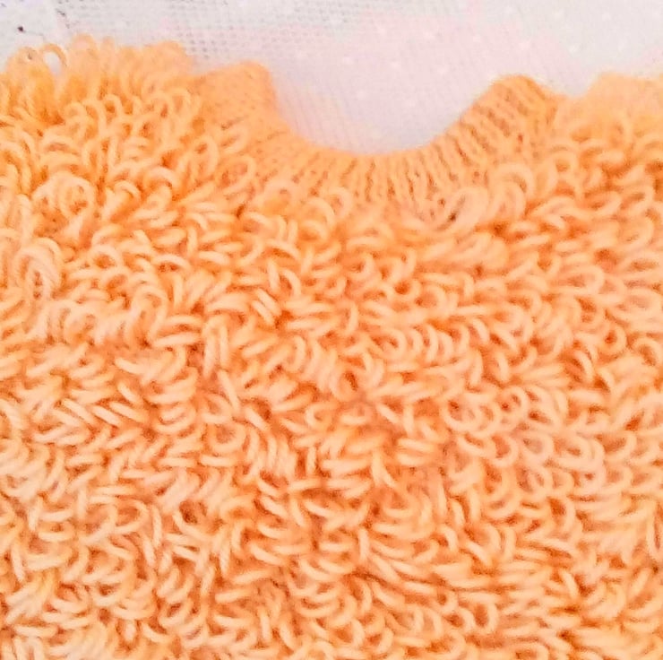 This fashionable and fun jumper is knitted using a loopy stitch in eige double knitting yarn. It would make a lovely addition to the wardrobe of any young lady.