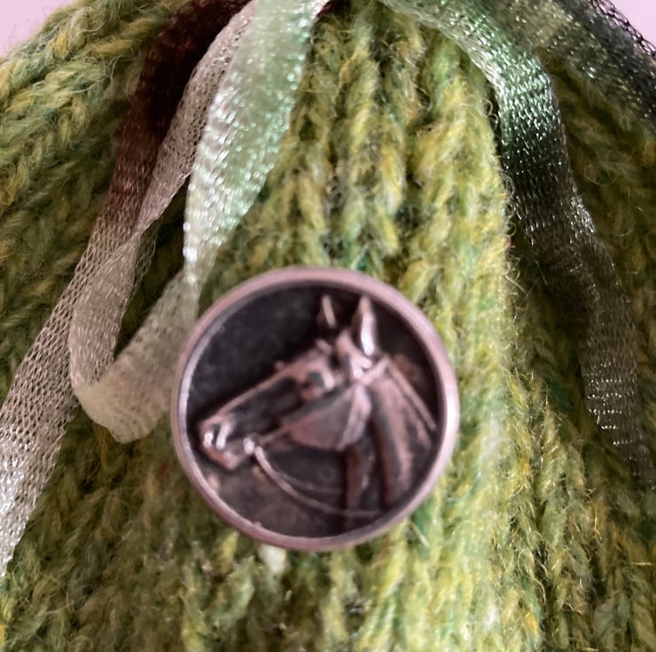 A multi coloured green ribbon pulls it together with a silver metal horse button in the centre