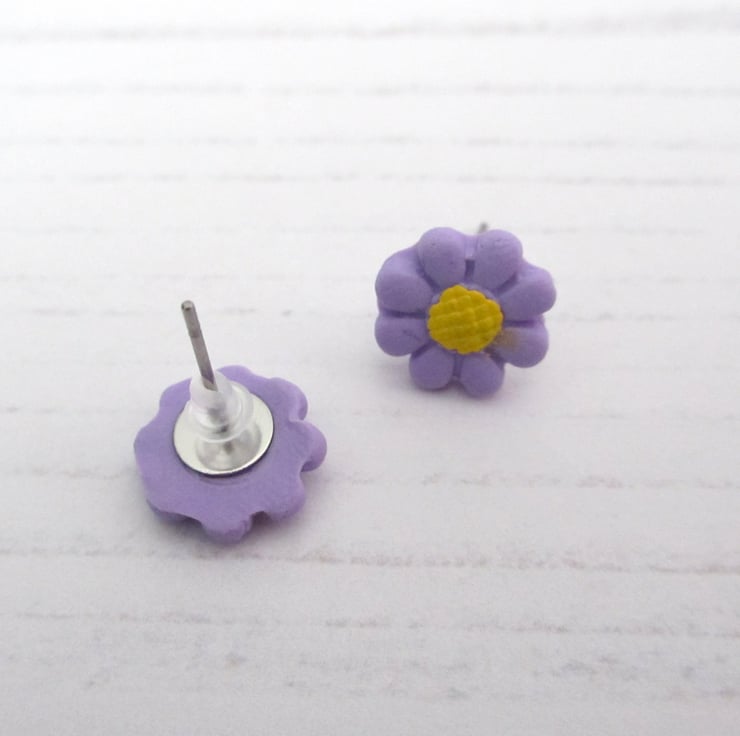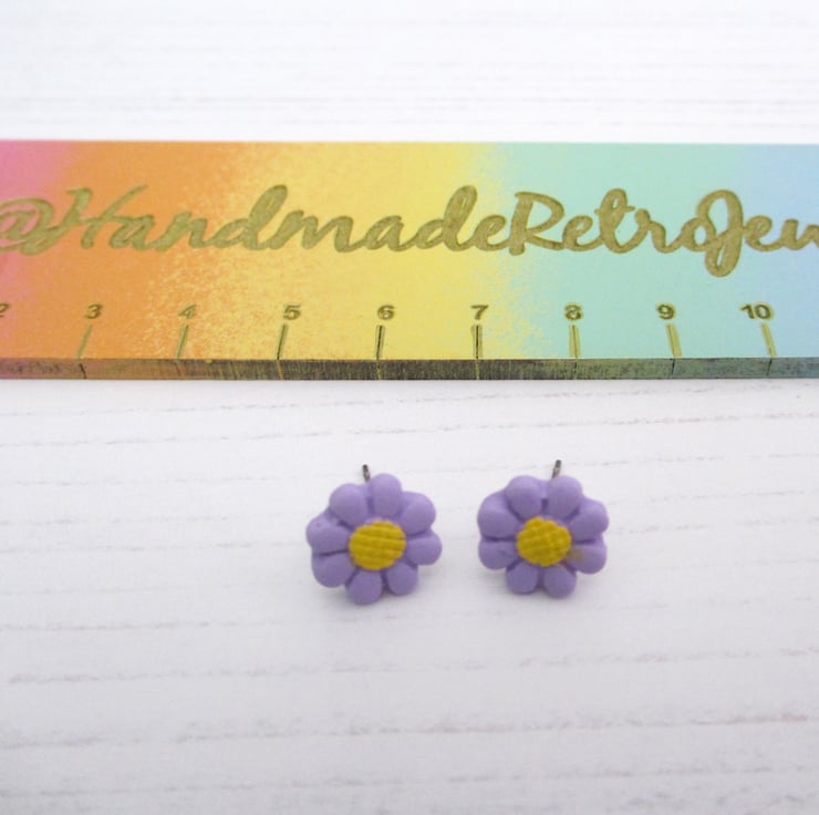 Just three sets available of these beautiful colourful daisy stud packs. Made from polymer clay in three different colours, with yellow detail hand painted using acrylic paint. Earrings are then fixed onto silver plated stud posts on the back and secured with a rubber back to wear.
