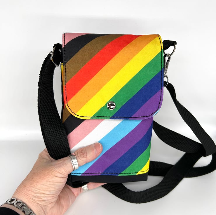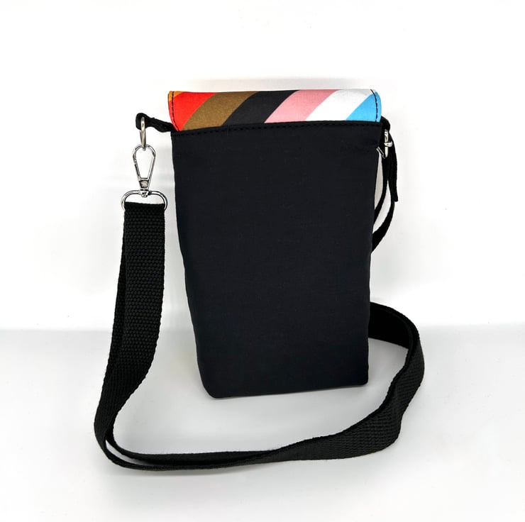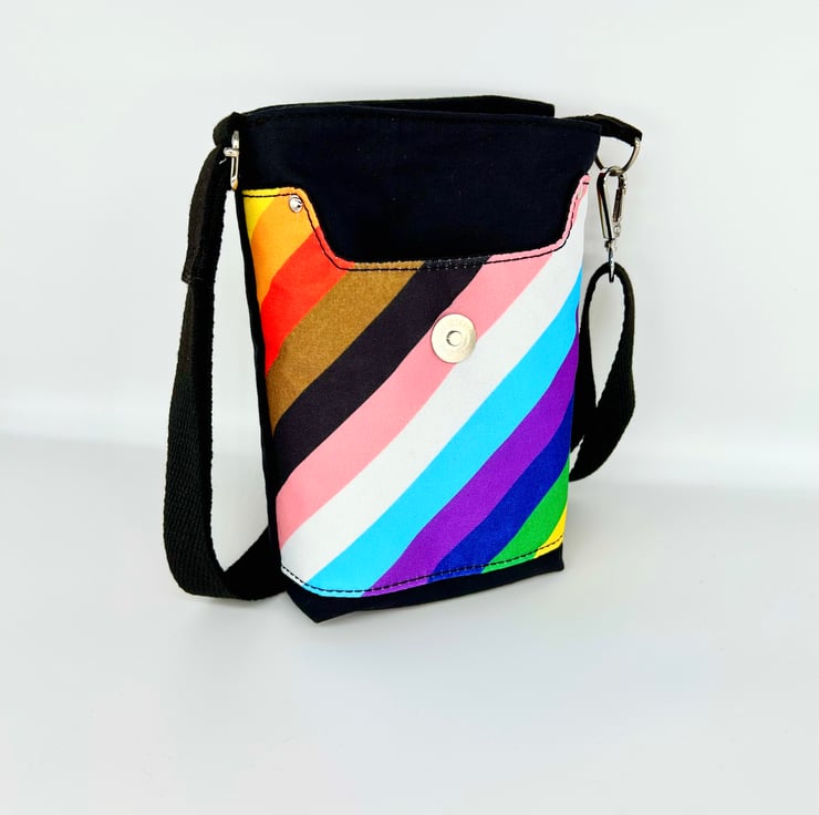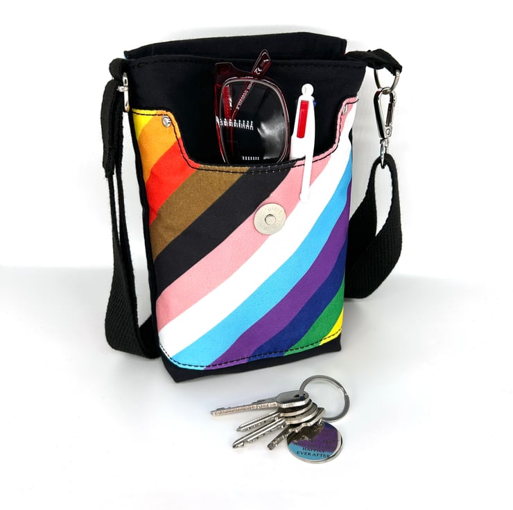Rainbow pride polyester fabric is used for the front of this crossbody. The rest of the bag is made and lined with black cotton fabric. There are two slip pockets, one on the front and one inside along with the main bag compartment which is boxed making room to carry a mobile, glasses, keys, coin purse, credit cards and other small everyday items.