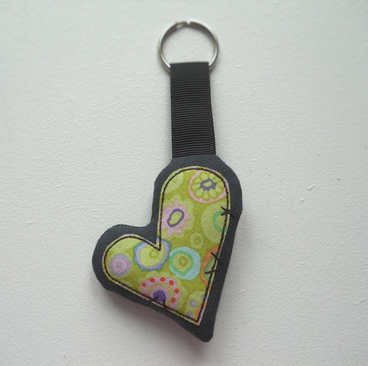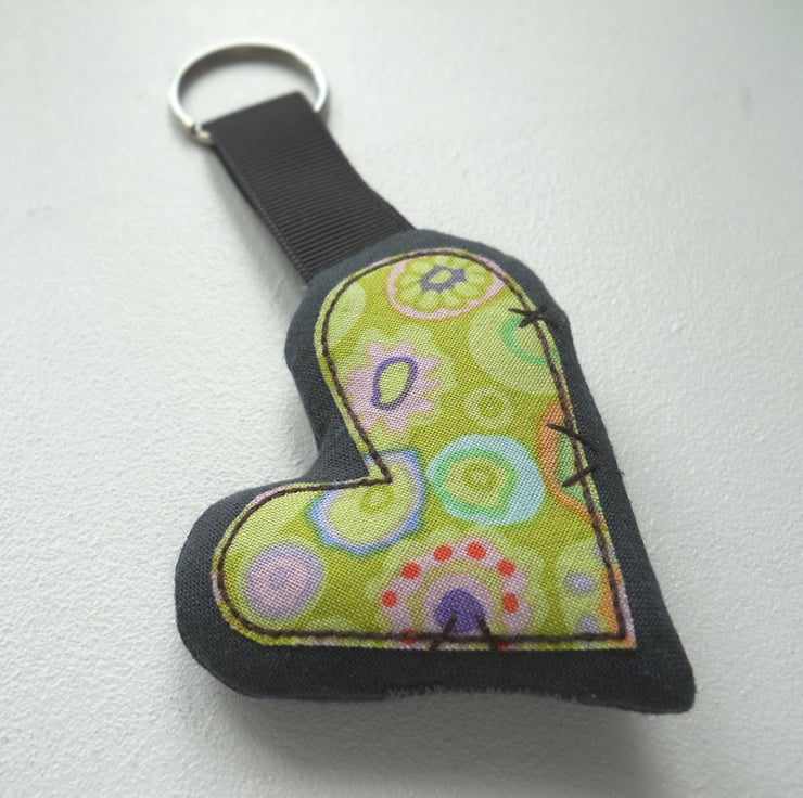 applique and free motion embroidered zombie heart keyring - lime green kaffe fassett fabric only 1 available - the heart in the photo is the one you will receive.