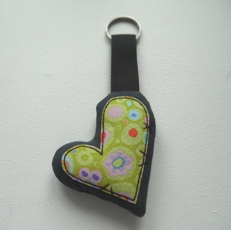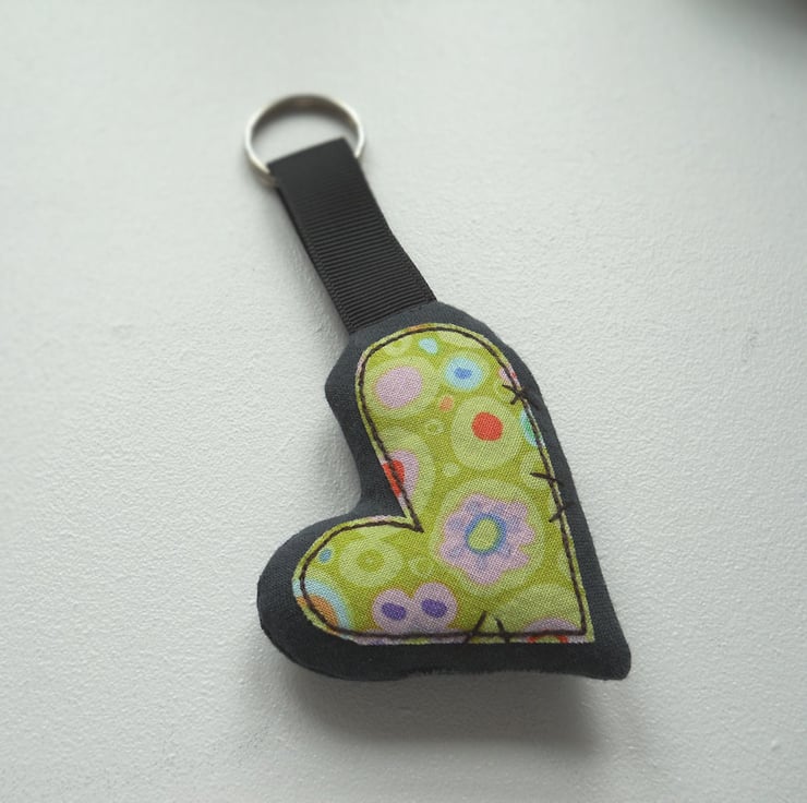 applique and free motion embroidered zombie heart keyring - lime green kaffe fassett fabric only 1 available - the heart in the photo is the one you will receive.