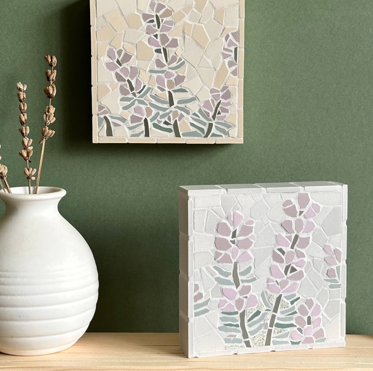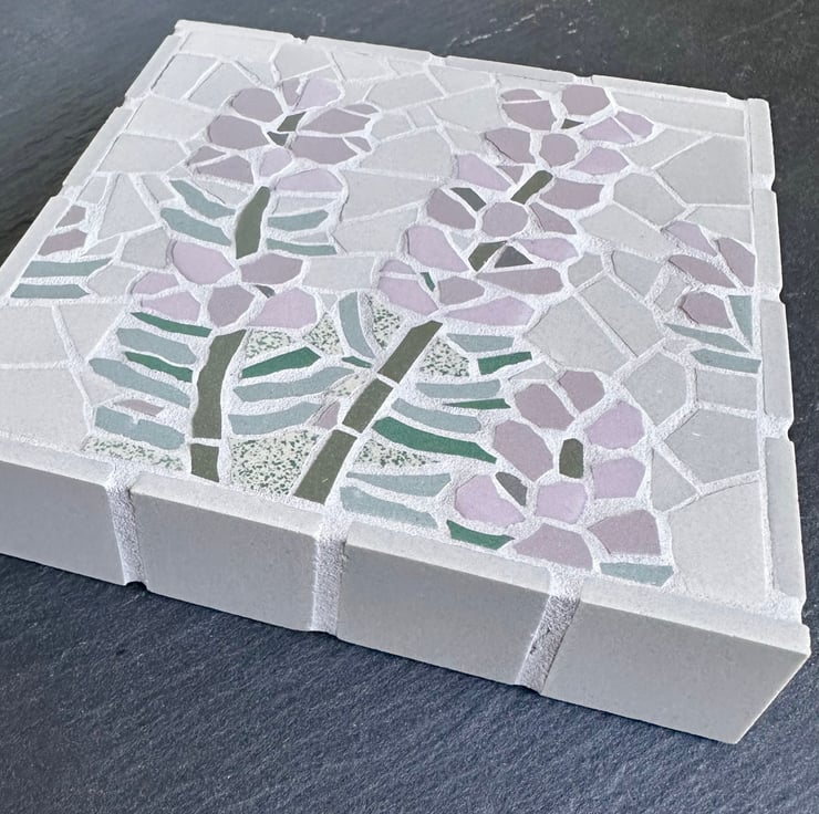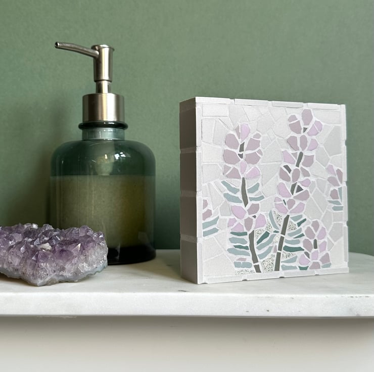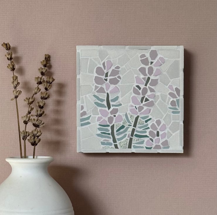 This original and mini floral art is created in mosaic and features, lavender sprigs on a silver grey background. Two types of lilac tile have been used, a matt tile called Parma and a slightly iridescent tile called Amethyst. Even though the tones are similar, the Amethyst tile shimmers slightly creating a lovely sense of depth.