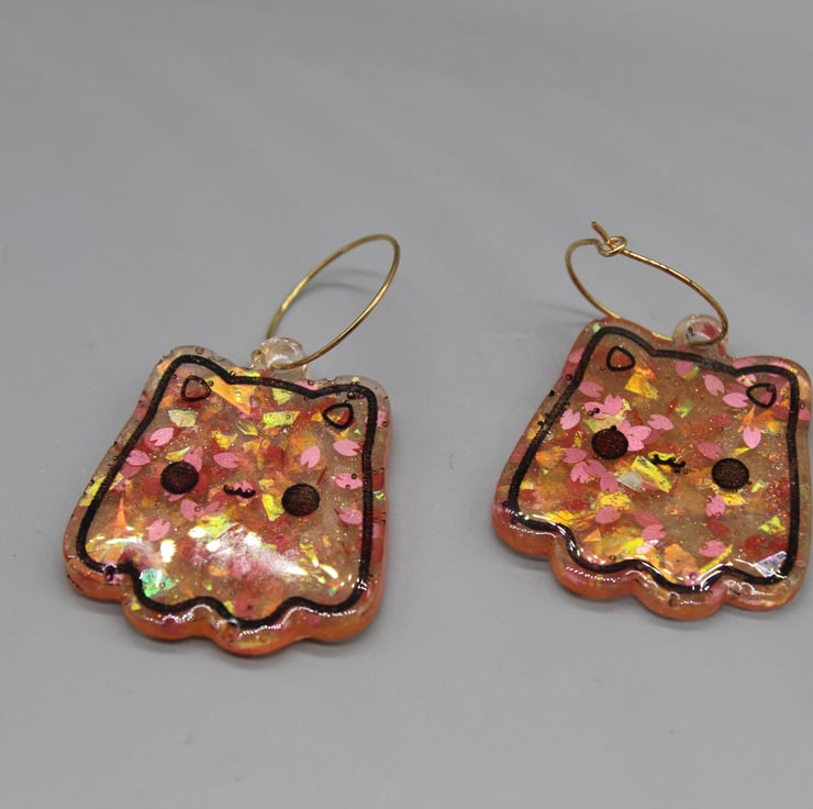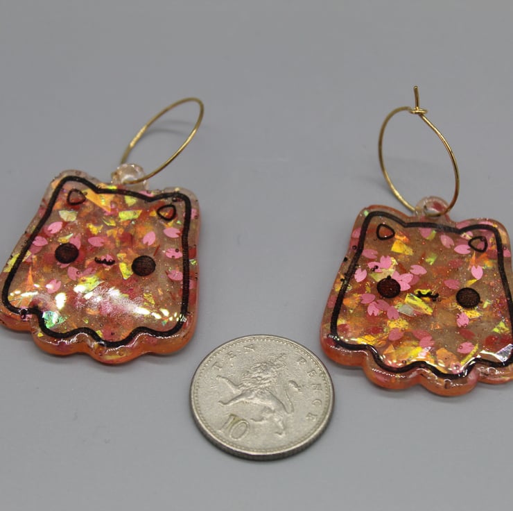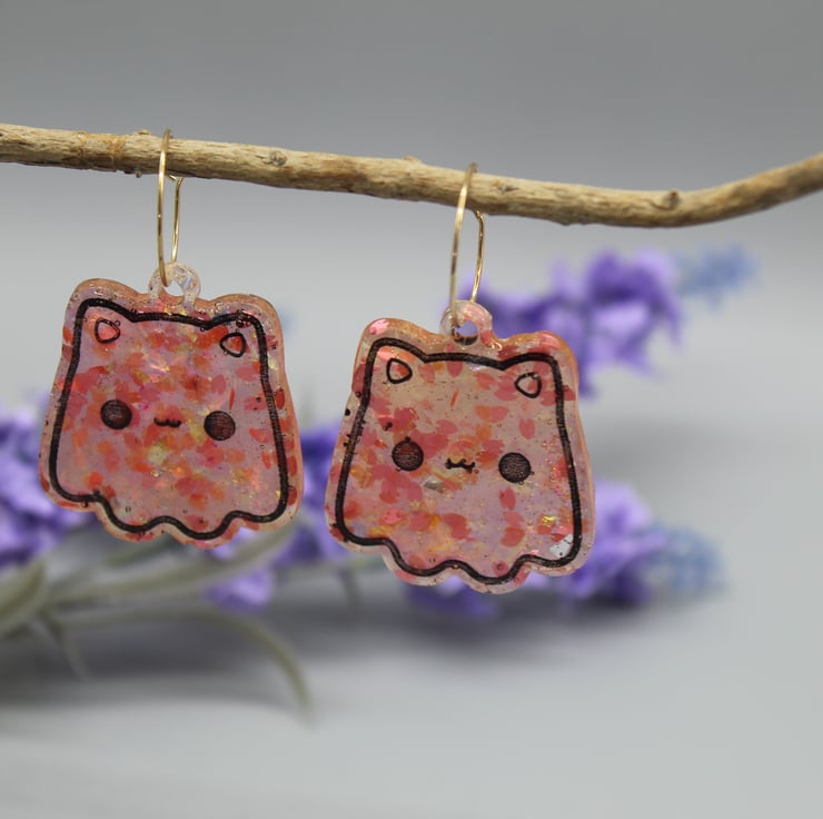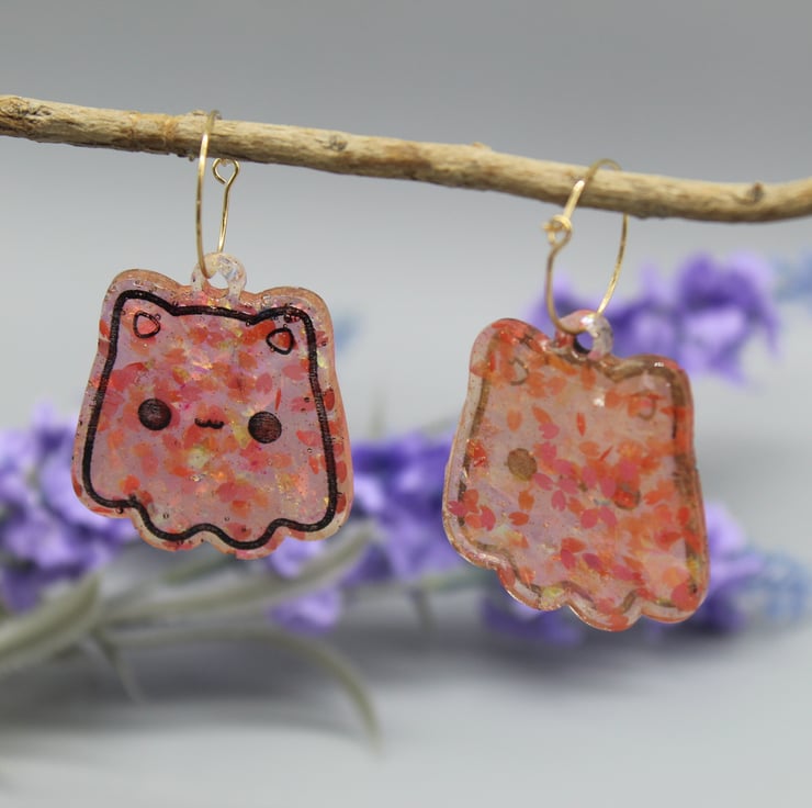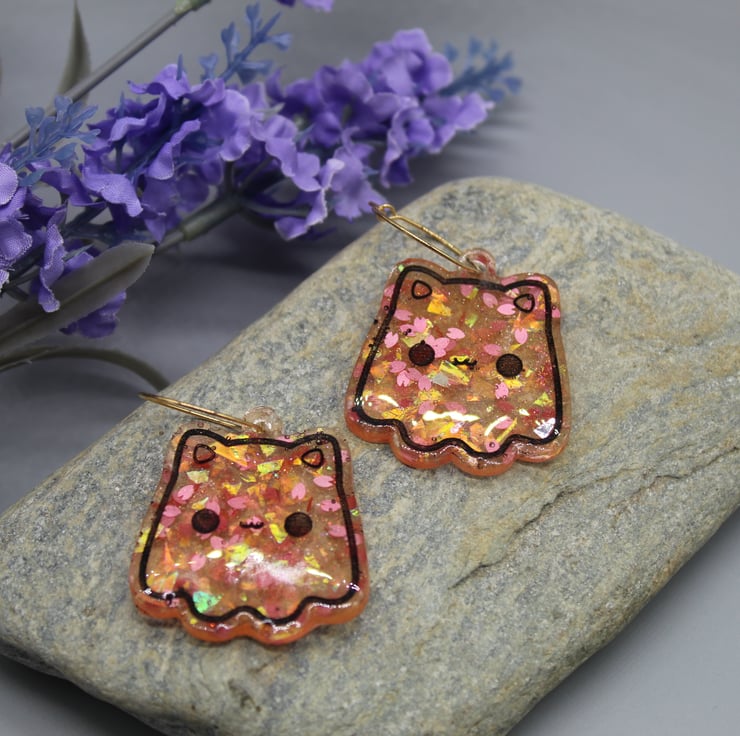 These amazing Cat Ghost earrings have been made with epoxy resin and coloured with a sakura glitter mix, including sakura petal glitter shapes and holographic foil. For the etched design, I have coloured it in black to make them stand out more.