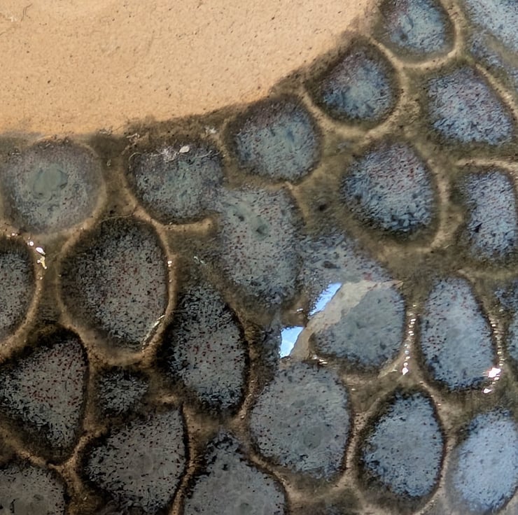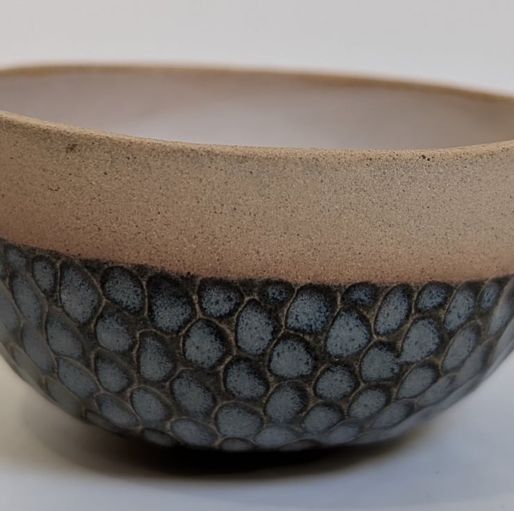Light coloured Stoneware clay, hand carved texture with cloud blue glaze and white interior.