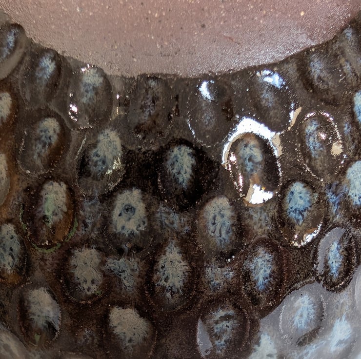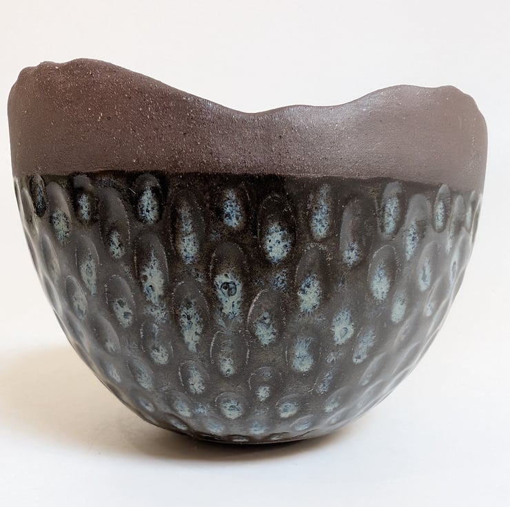 Dark red/brown Stoneware clay, hand carved texture with cloud blue glaze and white interior.