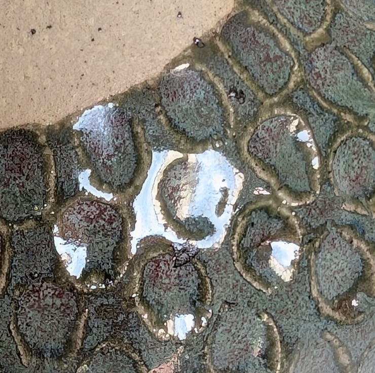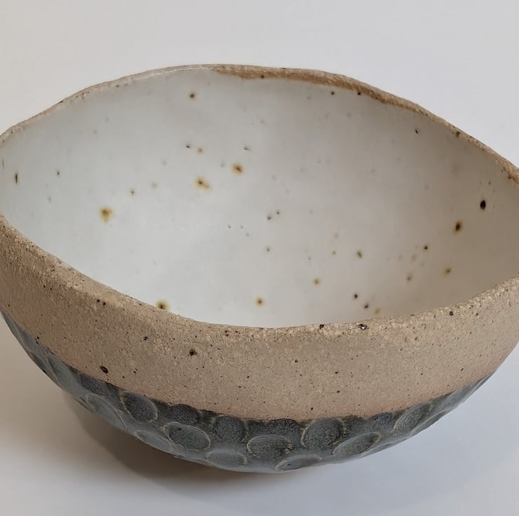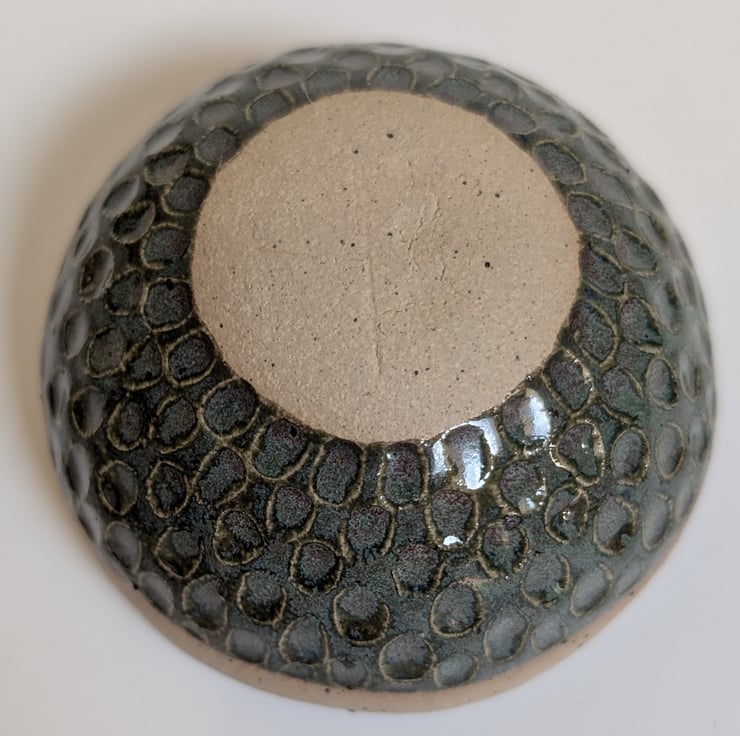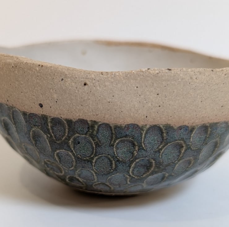 Flecked Stoneware clay, hand carved texture with kiwi green glaze and white interior.