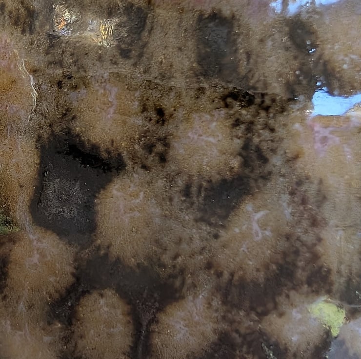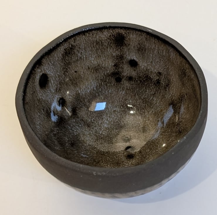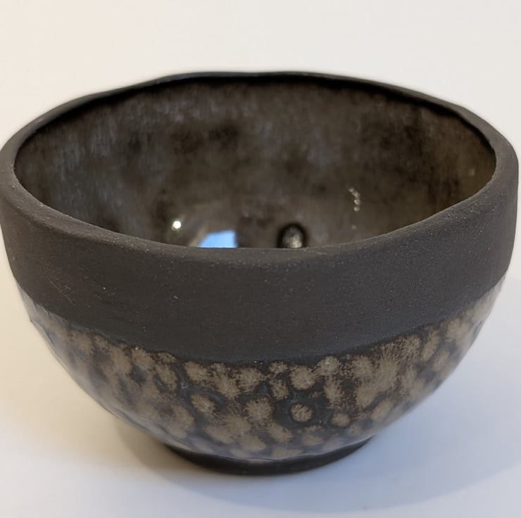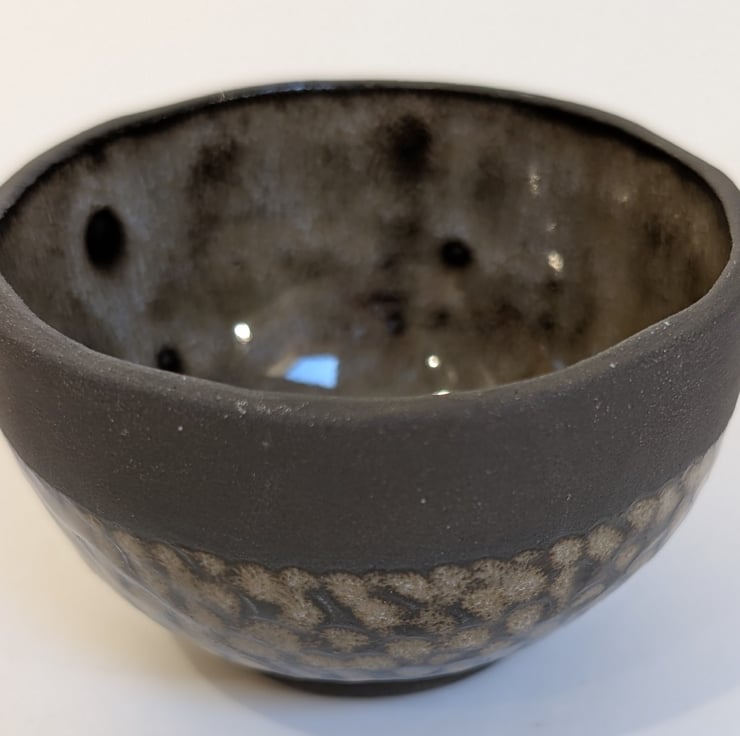 Vulcan black Stoneware clay, hand carved texture with grey/pink flecked glaze, inside and out.