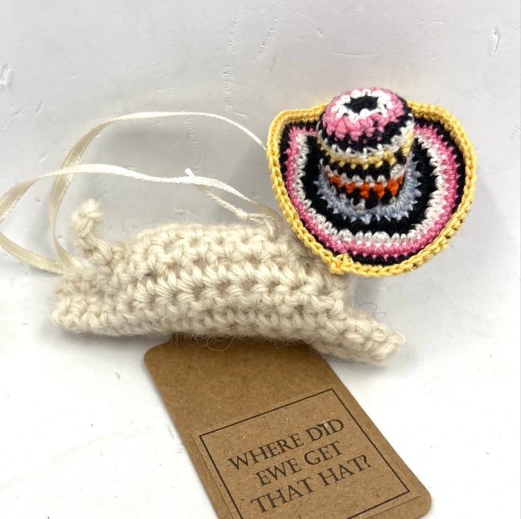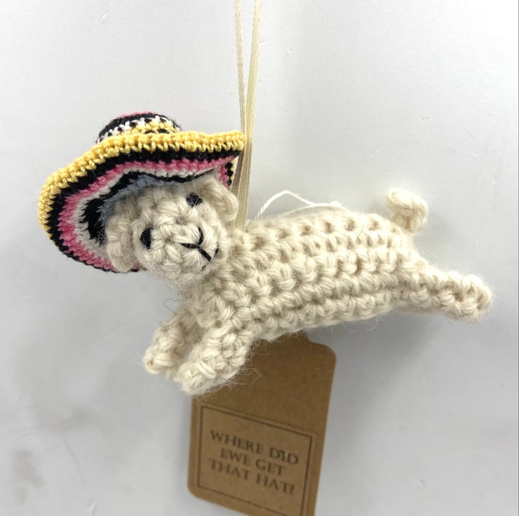 This happy sheep is crocheted in alpaca yarn and filled with polyester stuffing. She is proudly sporting a very smart hat crocheted in thin cotton yarn. There is a narrow ribbon hanging loop and a label which reads, Where did you get that hat? However, I am very happy to exchange this tag for one with wording of your choice. It would make a novel alternative to a greetings card!