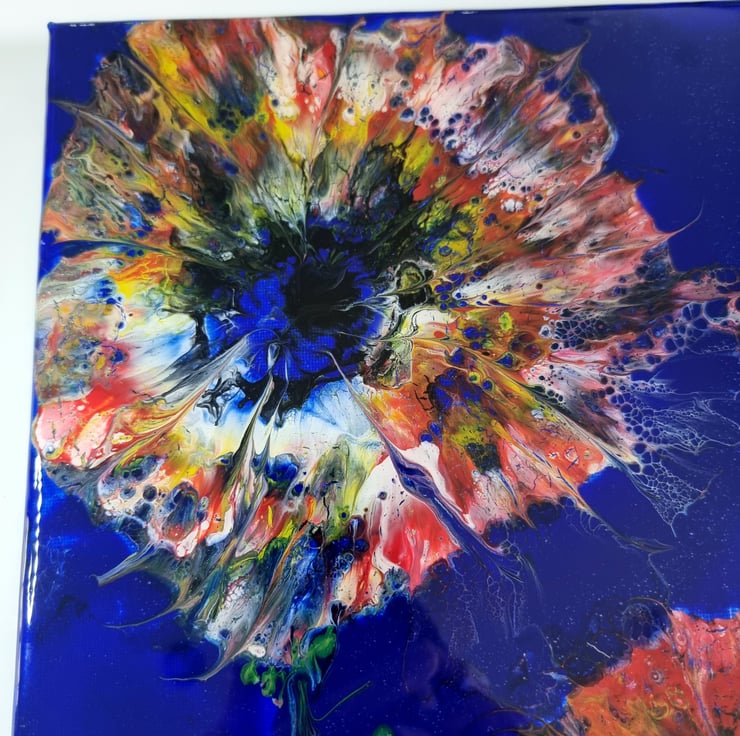 This started as a Dutch Pour and was supposed to created huge colourful blooms. However, if your paint is not mixed correctly (too thin) it will not do as you expect. Since there is no such thing as 'wrong' in abstract art, I battled on. The result is here and I must say, very pleasing. Not reproducible. This is about as rare as my work gets...
