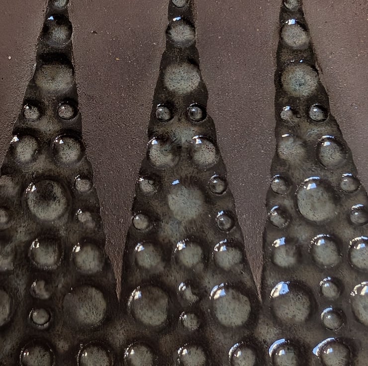 Handmade in dark red/brown stoneware clay with hand impressed triangle design finished in a dark blue glaze. Interior is white and blue. It can be used as a functional item or decorative piece.