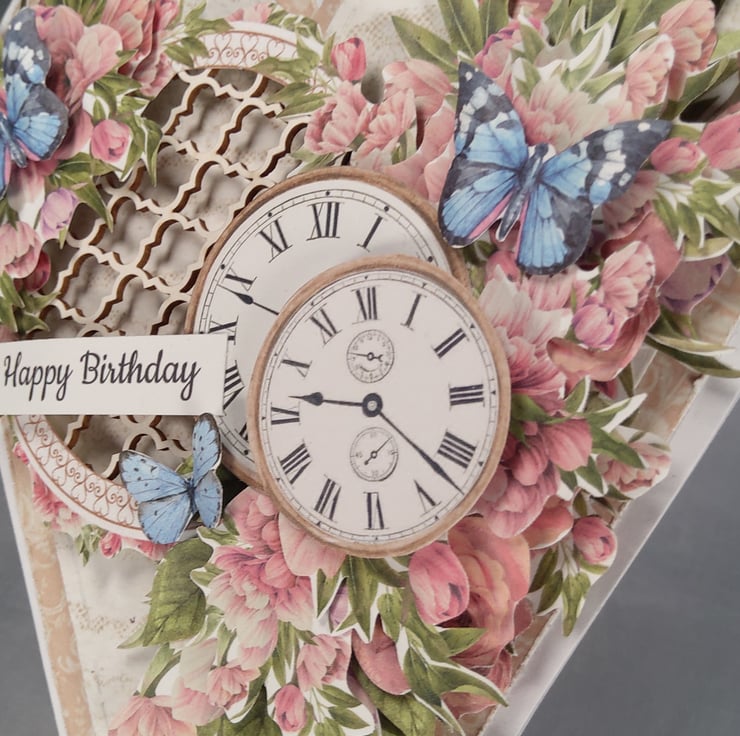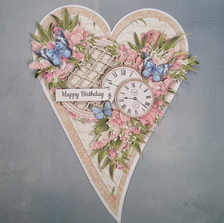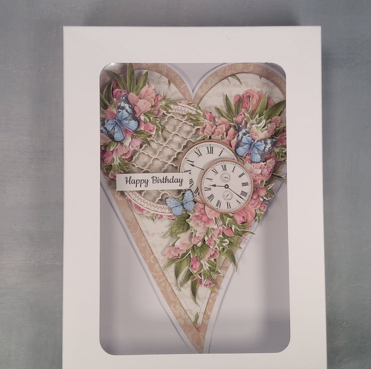 A heart-sgaped gift from the heart. What do you think? If you're looking for something special, this card needs to be in your basket. The card is decorated with a beautiful 3D composition of hand-cut paper elements. There one flowers, butterflies and beautiful openwork chipboard. This card will be left blank inside for you write your own message.All cards are packaged carefully to ensure they arrive with you in pristine condition.The set includes box with an aperture lid desing, they provide both protection and a clear view of the card inside. This card measures 8,25'x6' ( 21x15cm).