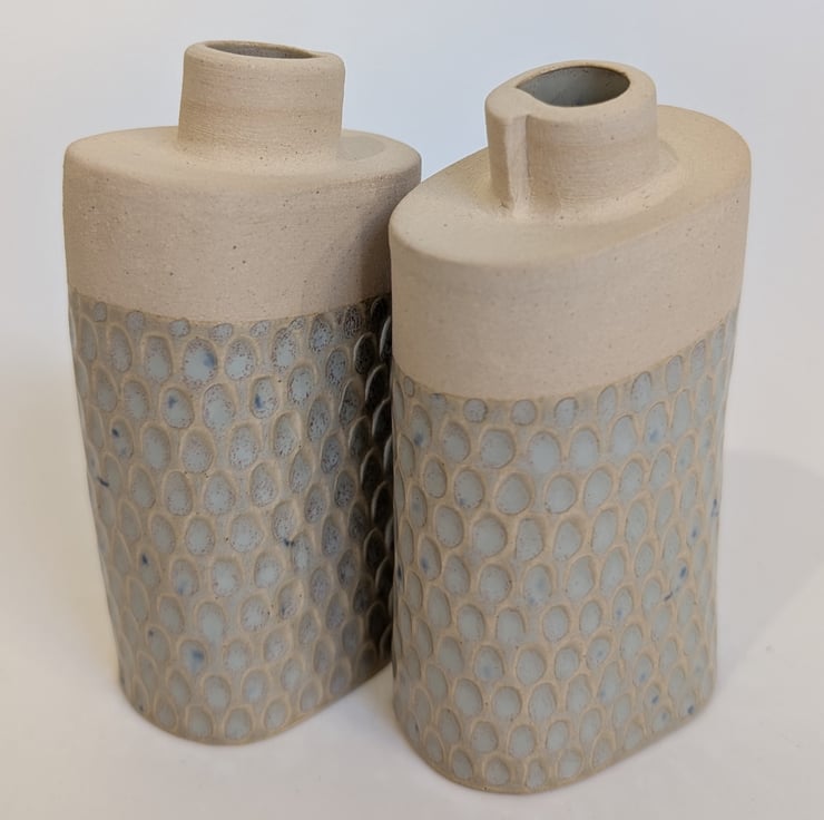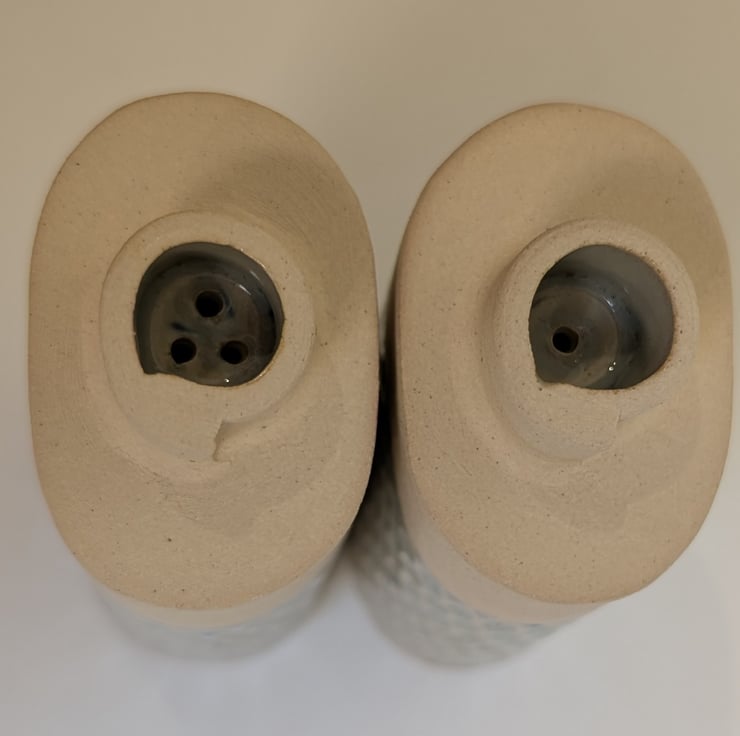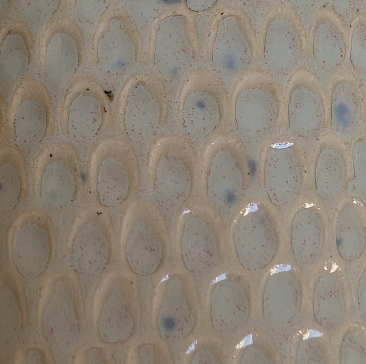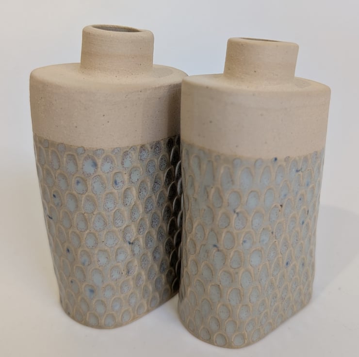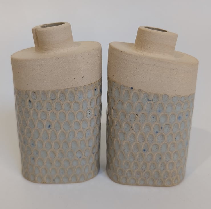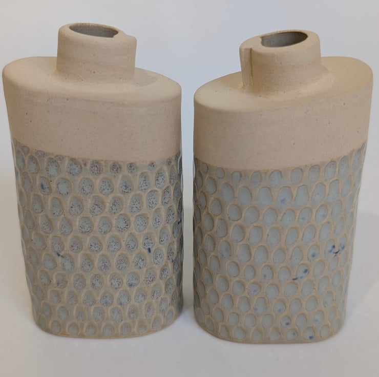These salt and pepper pots are slab built in stoneware clay with a carved 'fish scale' texture and finished in a 'cloud burst' pale blue/cream glaze. It is an unusual glaze with lots of variation in colour and the occasional red or blue fleck - see close up picture for colour.