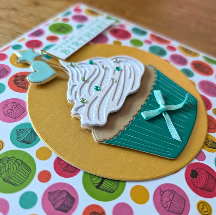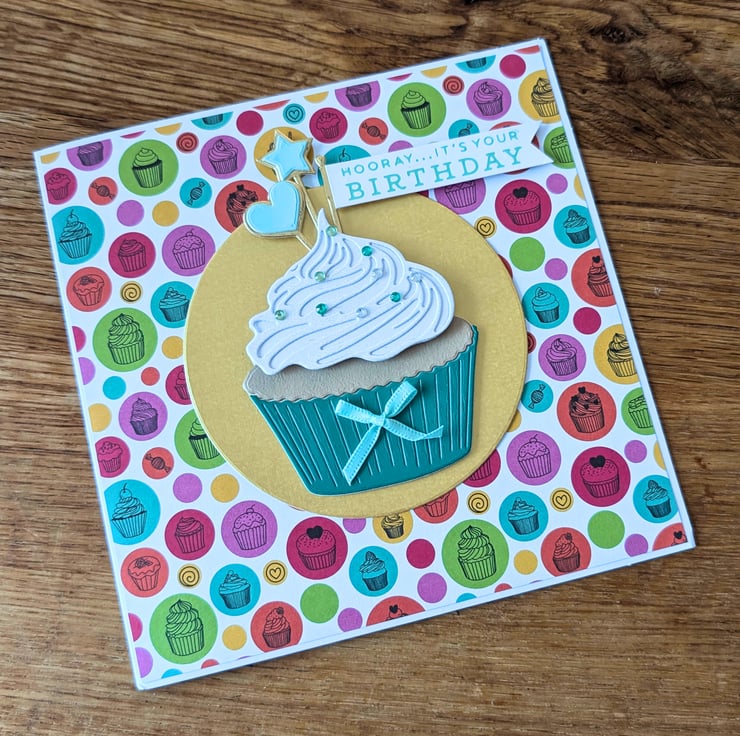 Bright, fun, and full of celebration—this handmade card is the perfect way to say happy birthday with a little extra flair. Featuring a playful spotty background and a delightful die-cut cupcake at the center, it’s sure to bring a smile to anyone’s face.