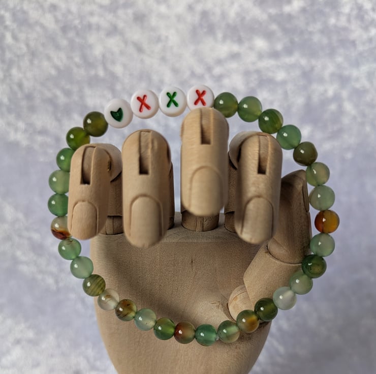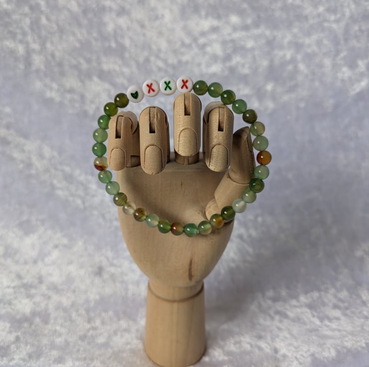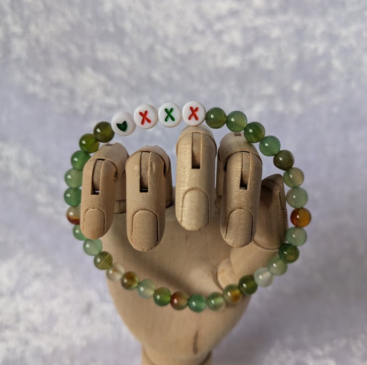 The beautiful earthy green colour of Peacock agate makes this a lovely bracelet. This one also has four white rondelle beads one with a heart symbol on, the others with XXX, symbolising three kisses. Peacock agate aids in happiness, joy and positivity.