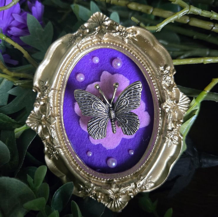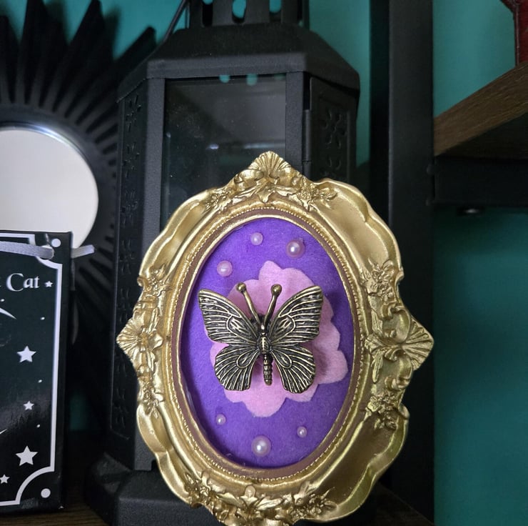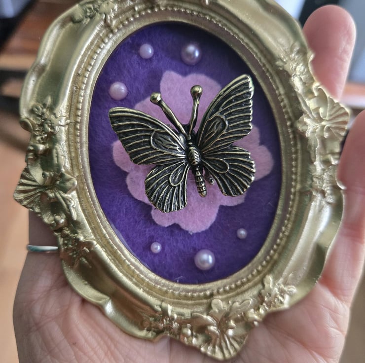 Handmade gold frames brass butterfly on felt with sparkles and resin!