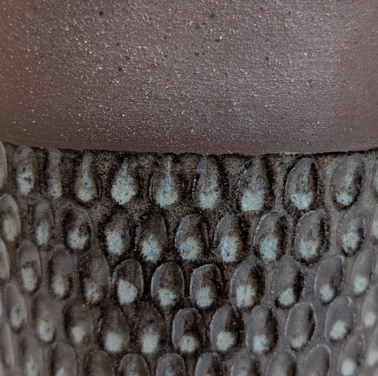 Slab built using dark red-brown stoneware clay, hand-carved surface to give a 'fish scale' design. Finished in a dark blue glaze with white interior.