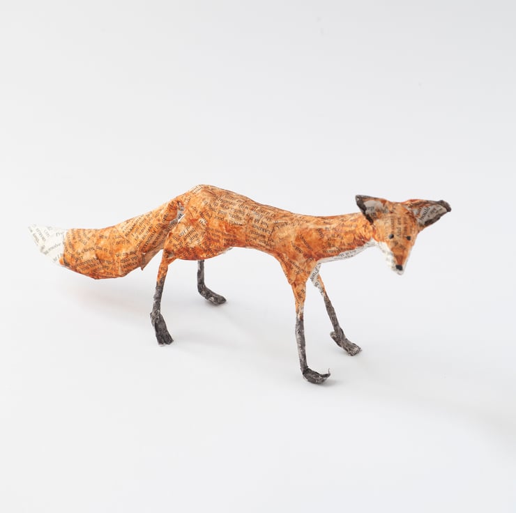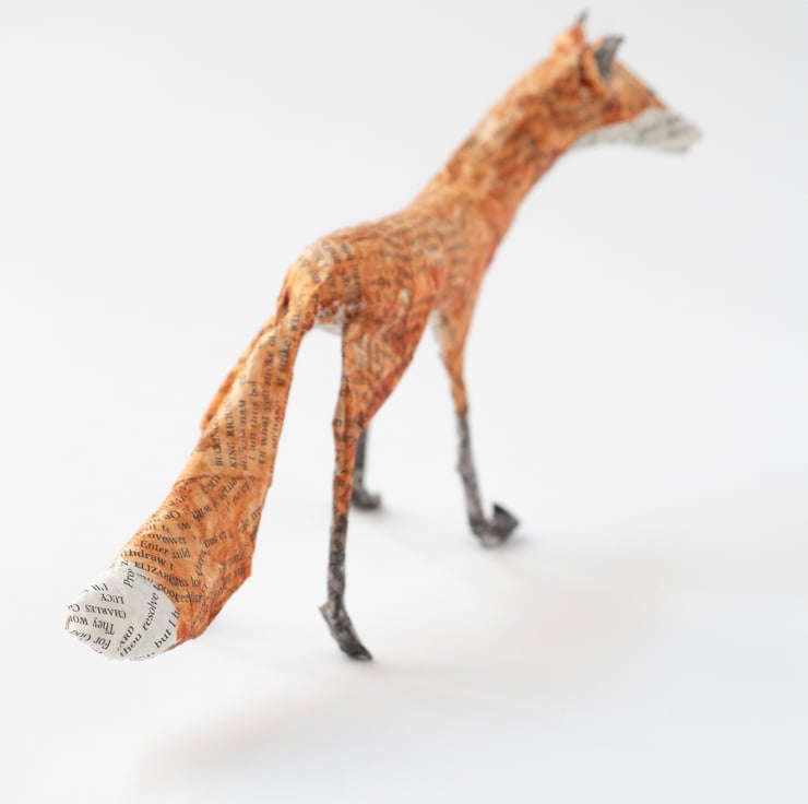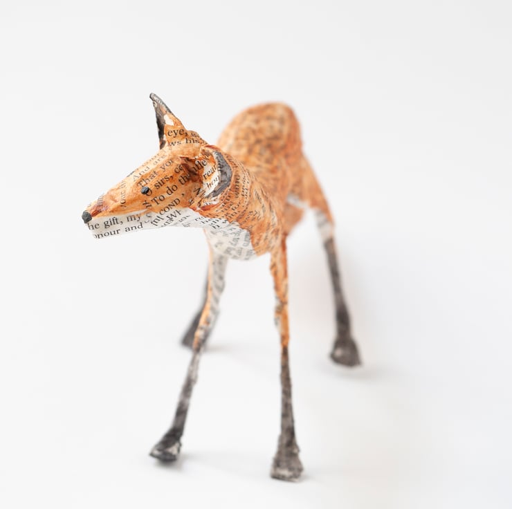 A handmade paper mache folk art sculpture of a standing fox. It is created from paper mache using book paper, wire and watercolour and is approx 10cm high x 23cm long. Made with newspaper, wire, glue, pages from Shakespeare, and watercolour paint.