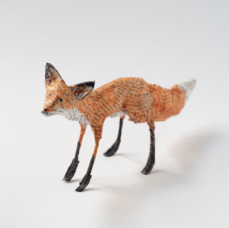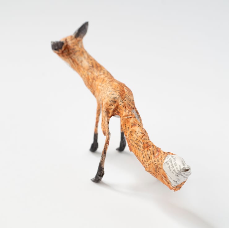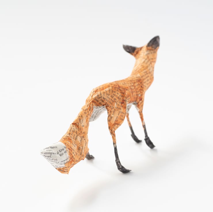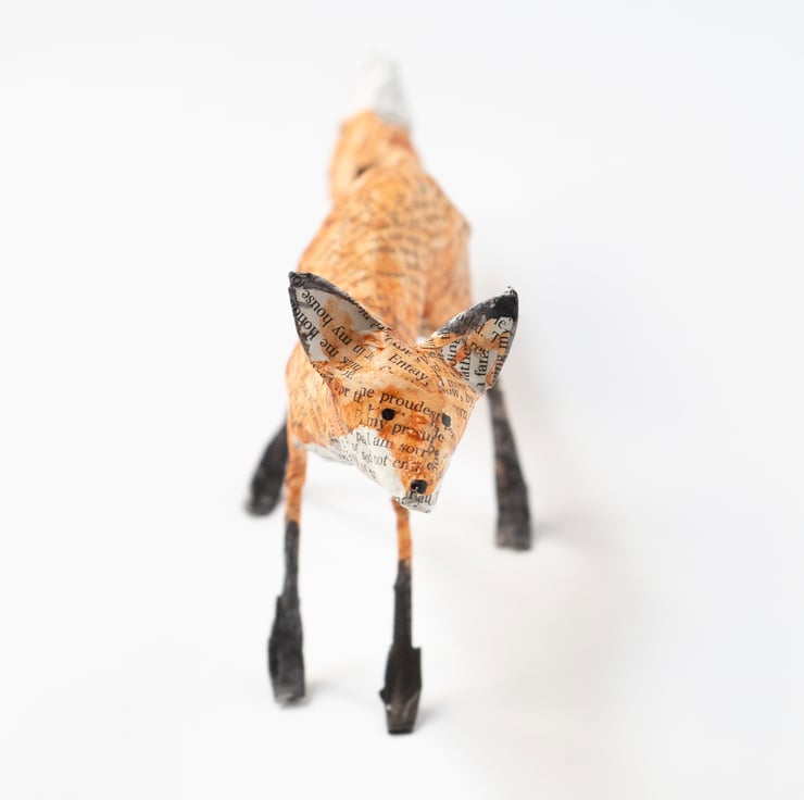 A handmade paper mache folk art sculpture of a standing fox. It is created from paper mache using book paper, wire and watercolour and is approx 11cm high x 24cm long. Made with newspaper, wire, glue, pages from Shakespeare, and watercolour paint.