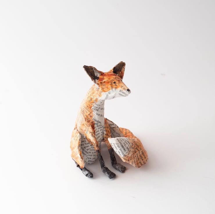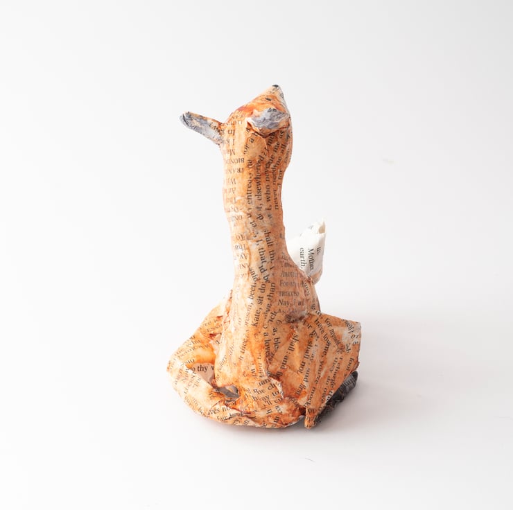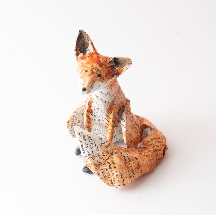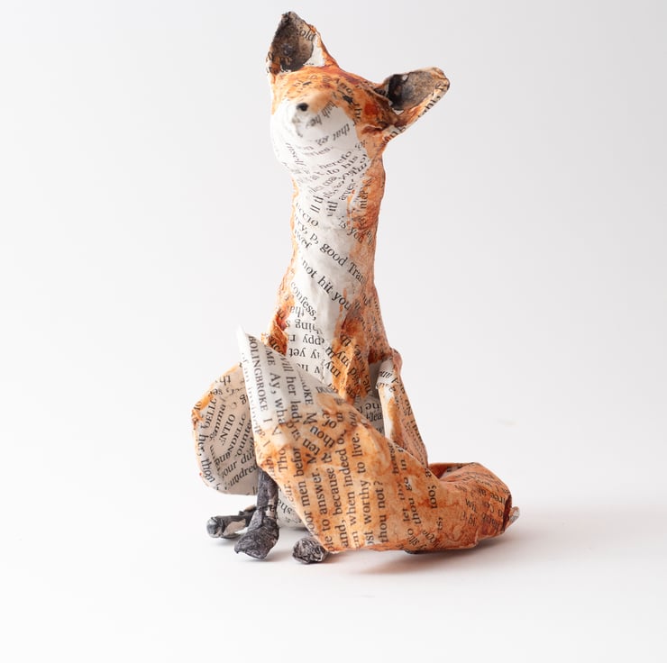 A handmade paper mache folk art sculpture of a sitting fox. It is created from paper mache using book paper, wire and watercolour and is approx 11cm high. Made with newspaper, wire, glue, pages from Shakespeare, and watercolour paint.