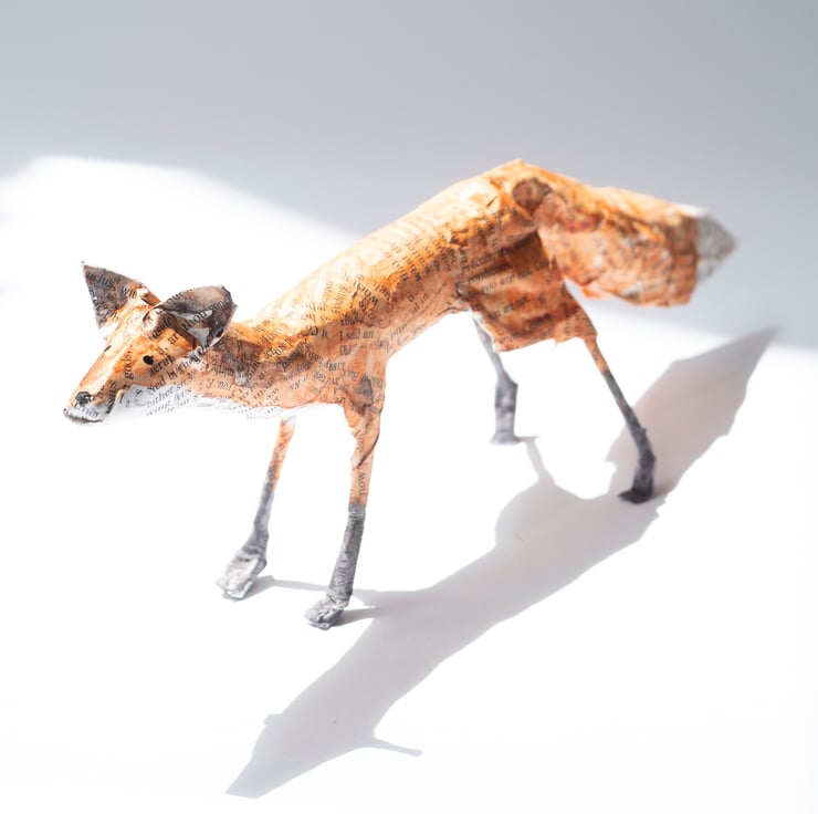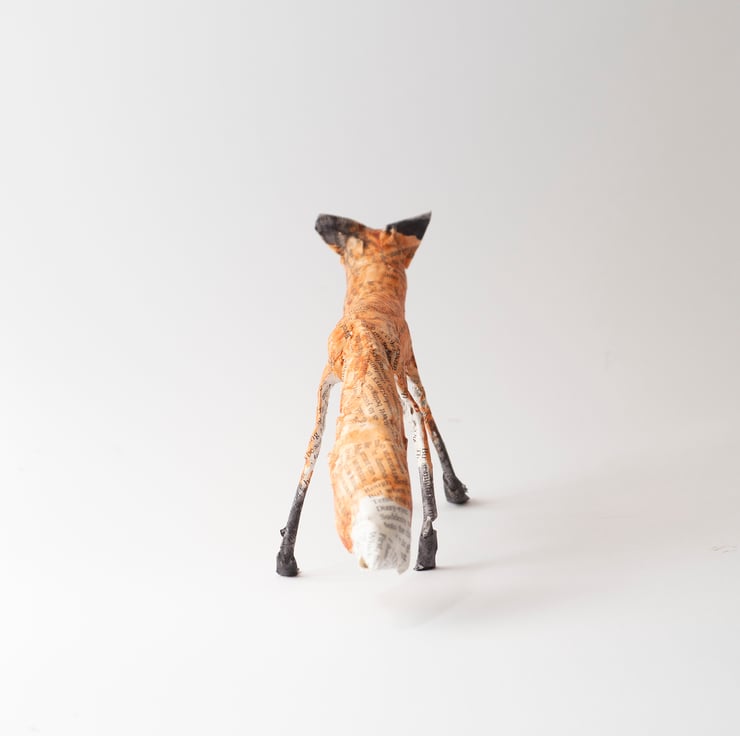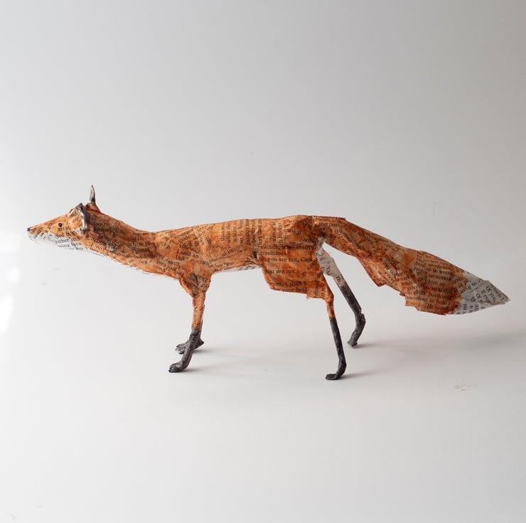 A handmade paper mache folk art sculpture of a standing fox. It is created from paper mache using book paper, wire and watercolour and is approx 10cm high x 23cm long. Made with newspaper, wire, glue, pages from Shakespeare, and watercolour paint.