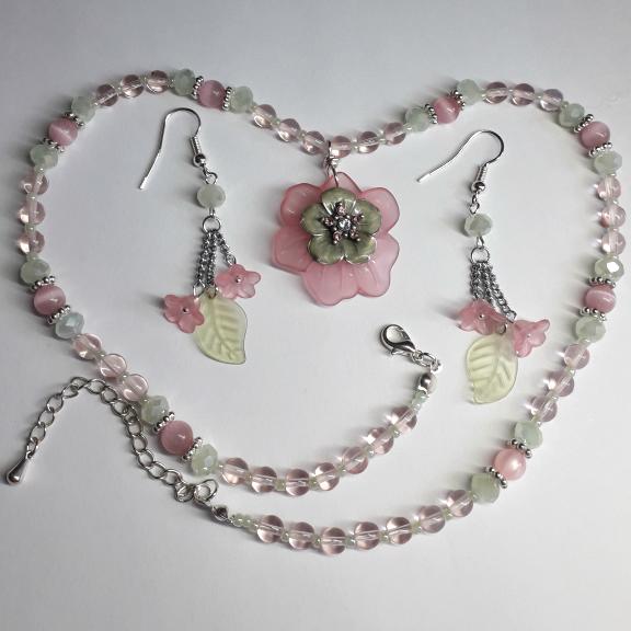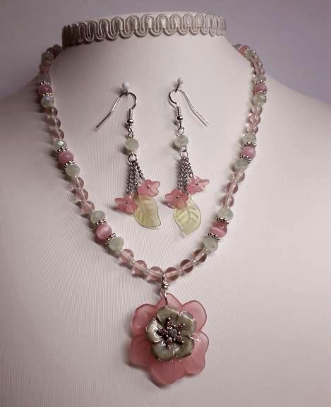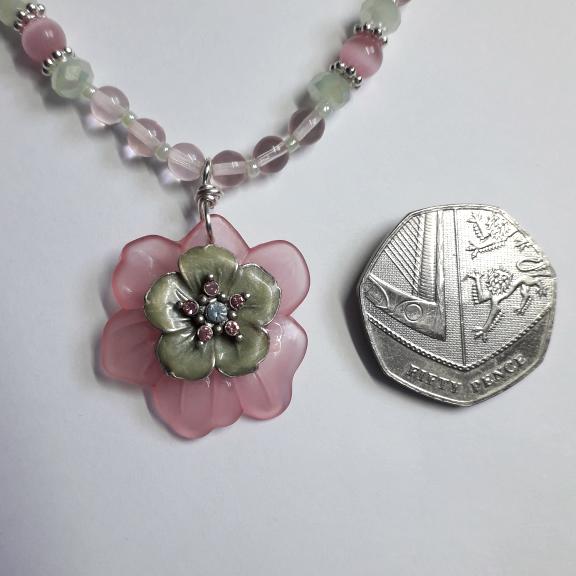 The pendant is made with a pink lucite flower to which I have attached a pale green flower from a broken necklace which has pink and clear rhinestones in the centre.